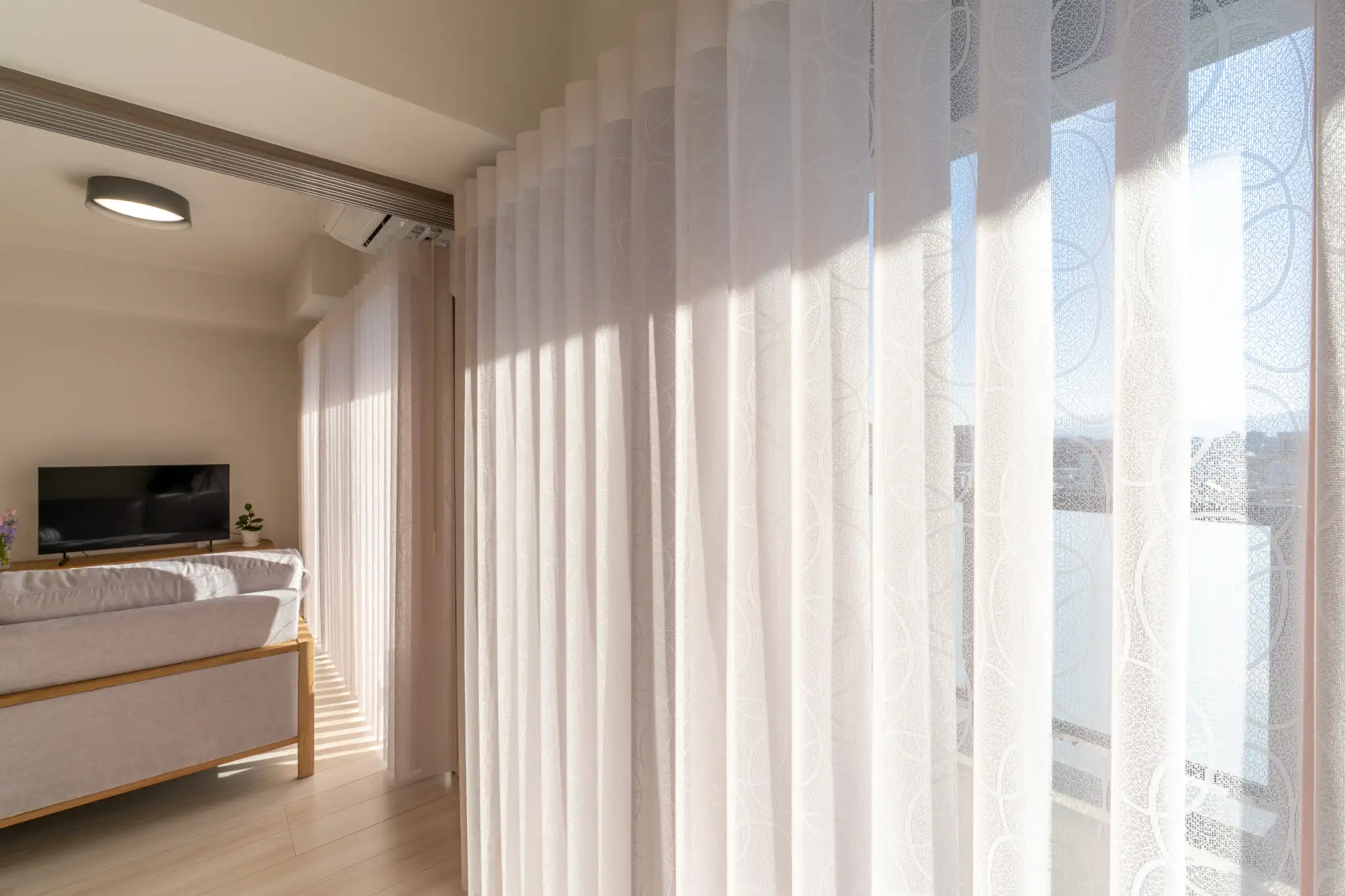 天候や光が美しく入る時間帯を選び、やわらかな自然光の中でブラインドの模様そのものだけでなく、その模様が影としても表現できるよう意識して撮影しました。