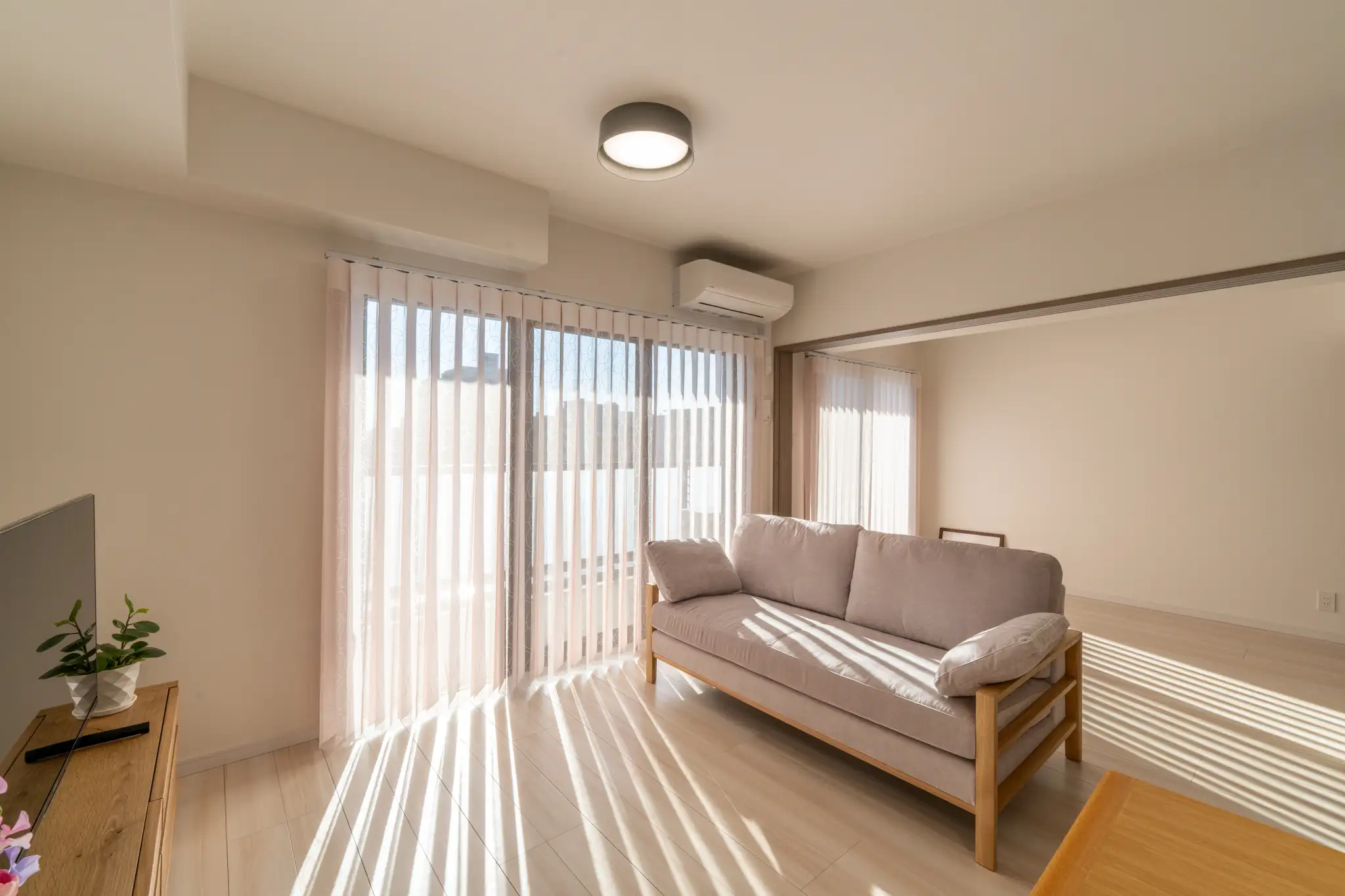 奥には仕切りが設けられ、前後で異なる時間を過ごせる構成となっており、それぞれを寝室として活用できるため最大4名様まで宿泊可能な機能性も兼ね備えています。