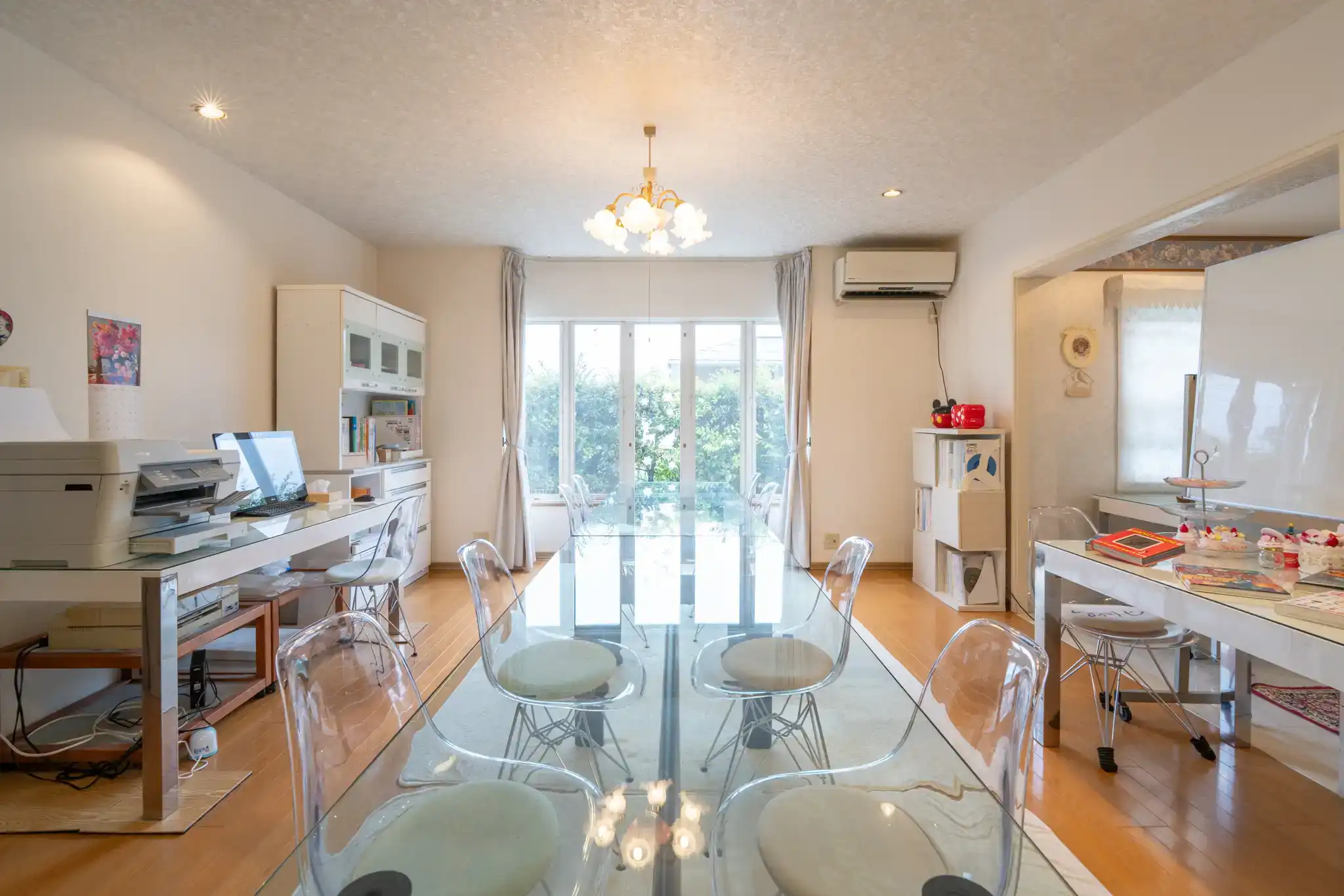 廊下を抜けた先のお部屋の窓からはお寺を望む落ち着いた景観が広がり、2階には食器やカトラリーまで揃ったキッチンと整えられたリビング、さらに奥には本に囲まれた畳の空間も設けられています。