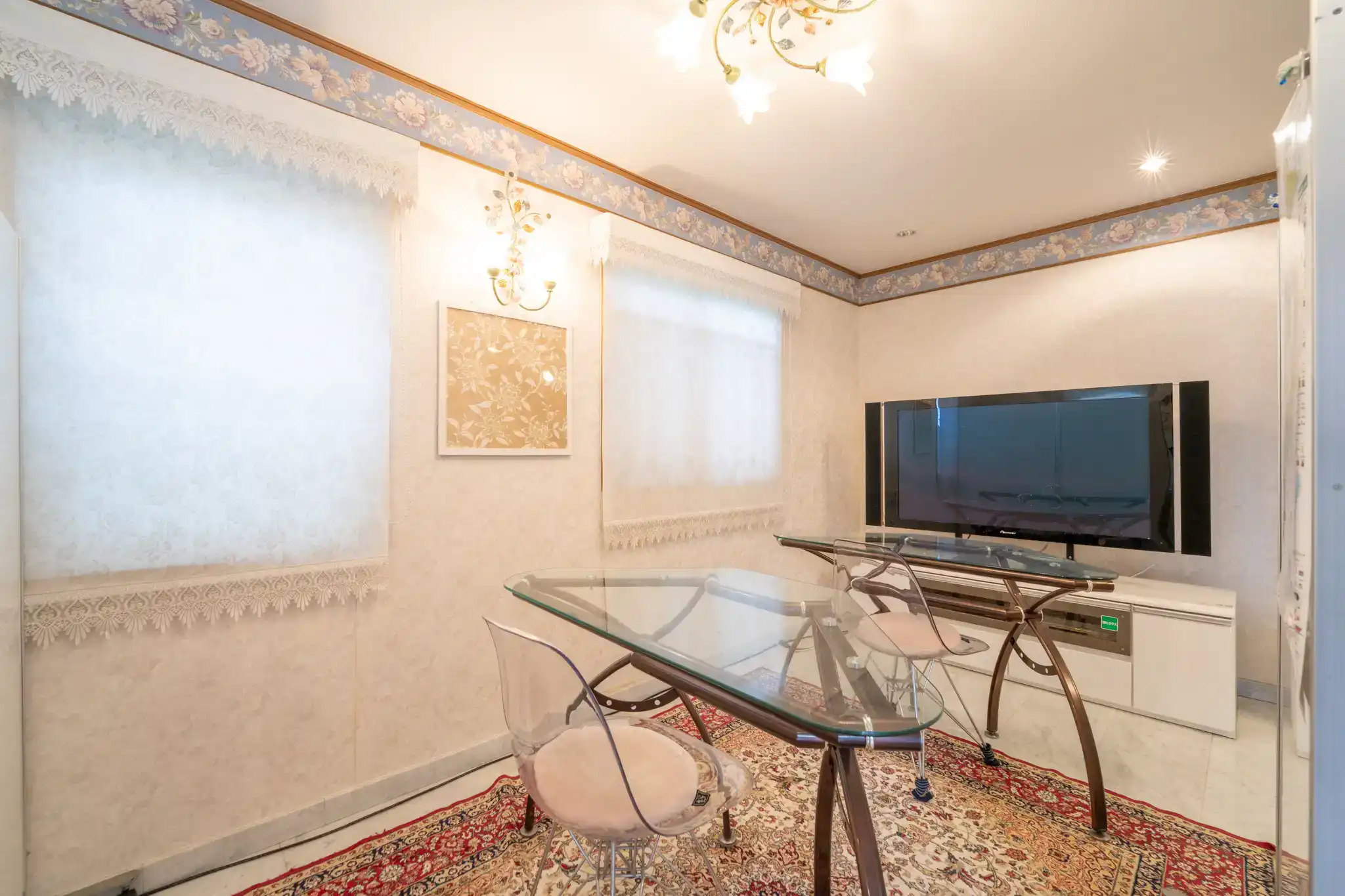 3階にはフローリングの洋室があり、その背中合わせに続きの和室が配置された広々とした構成で、遮光性のある印象的なカーテンを活かし、昼間の撮影ながら夜と昼それぞれの表情を演出しました。