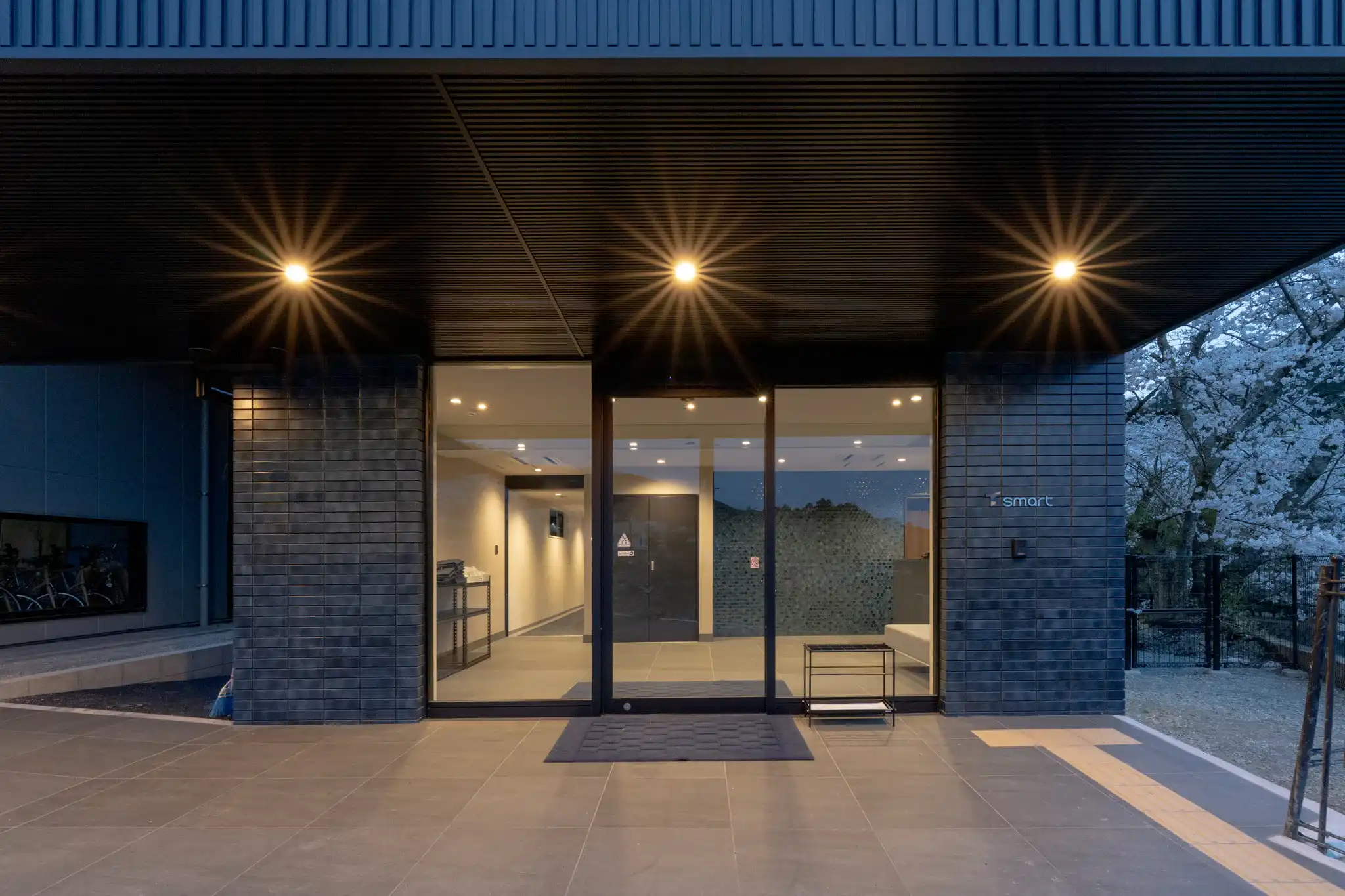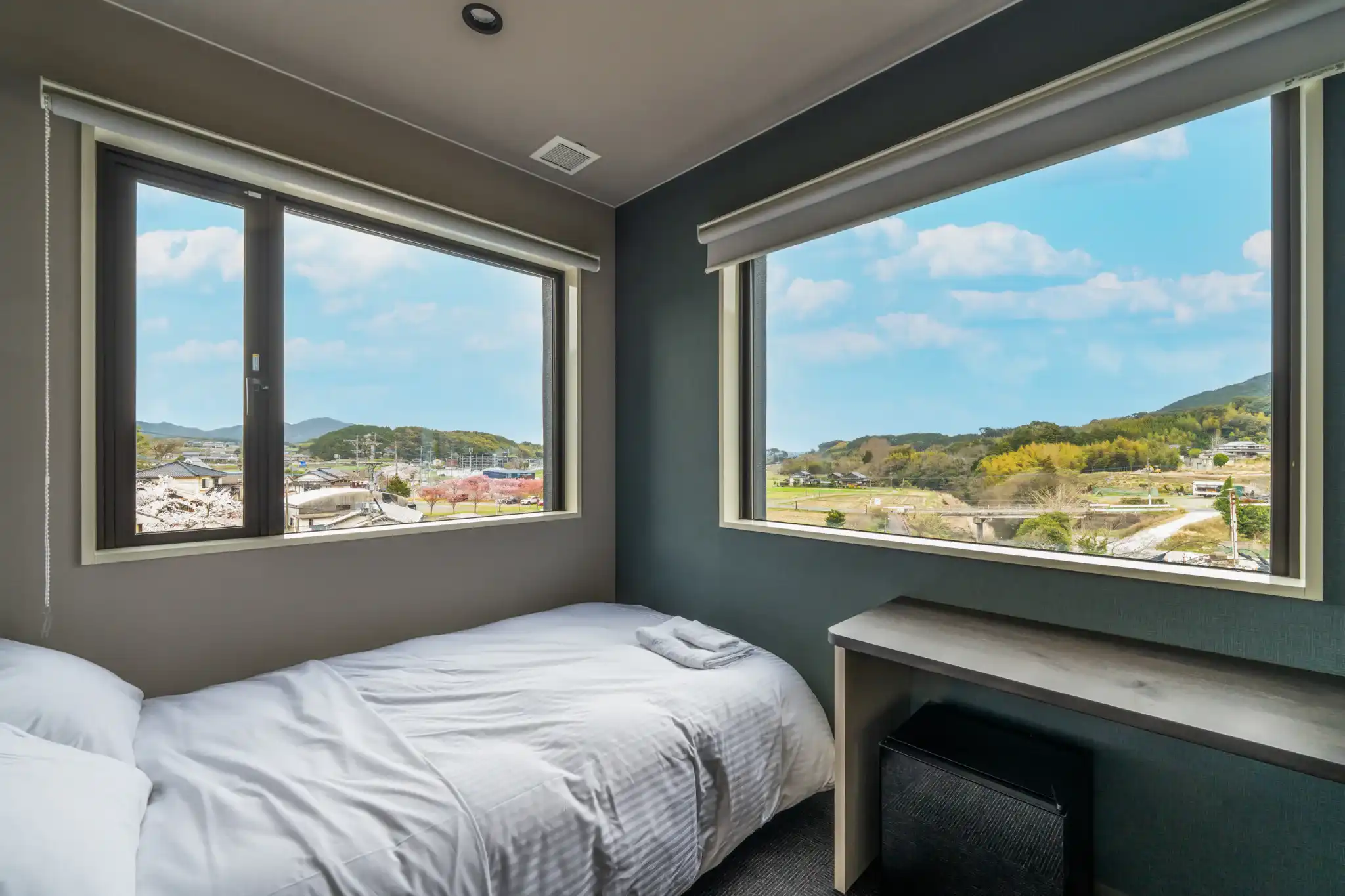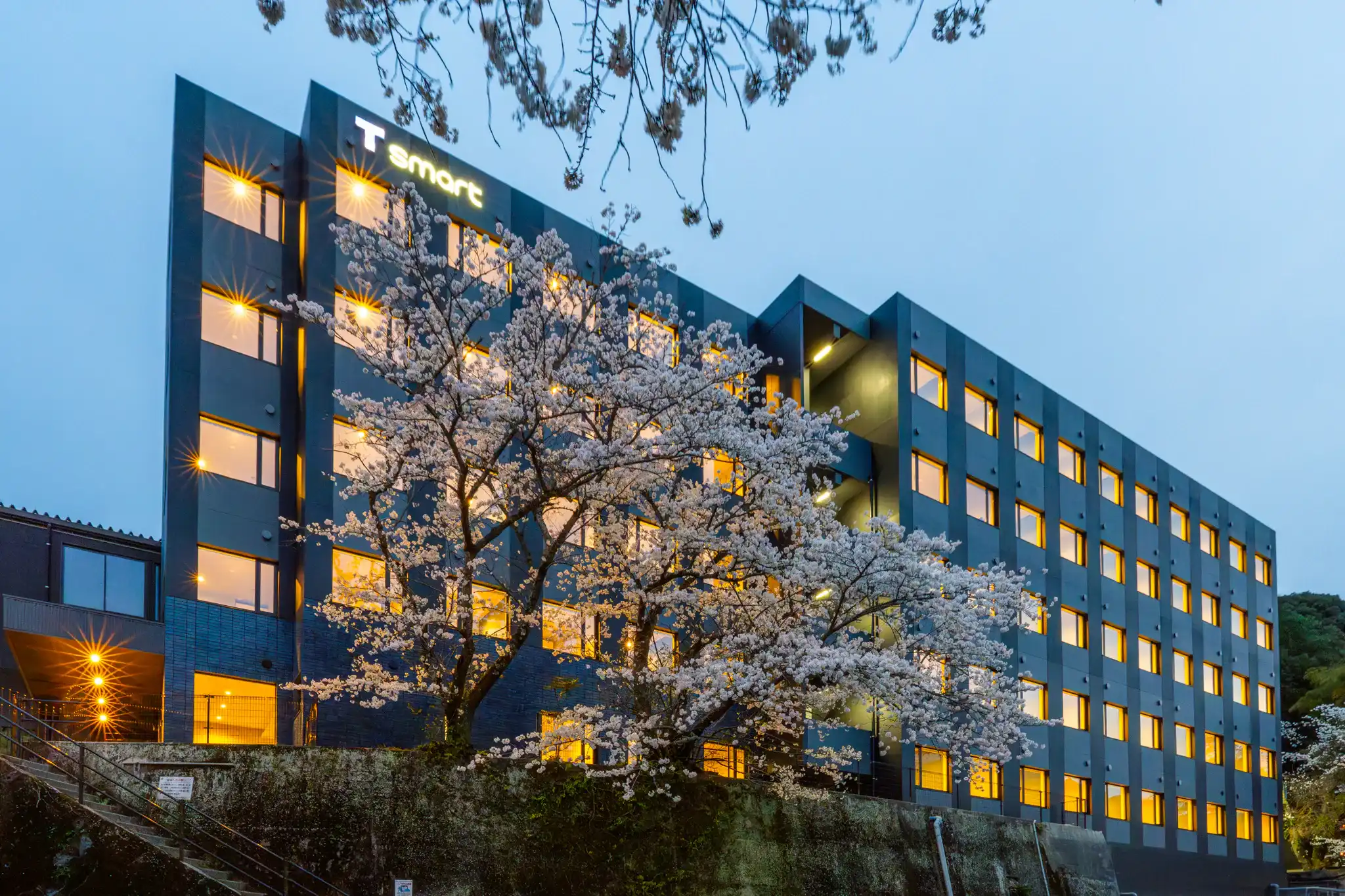 福岡・脇田温泉に新しくオープンしたビジネスホテルを、桜が満開の春に撮影しました。