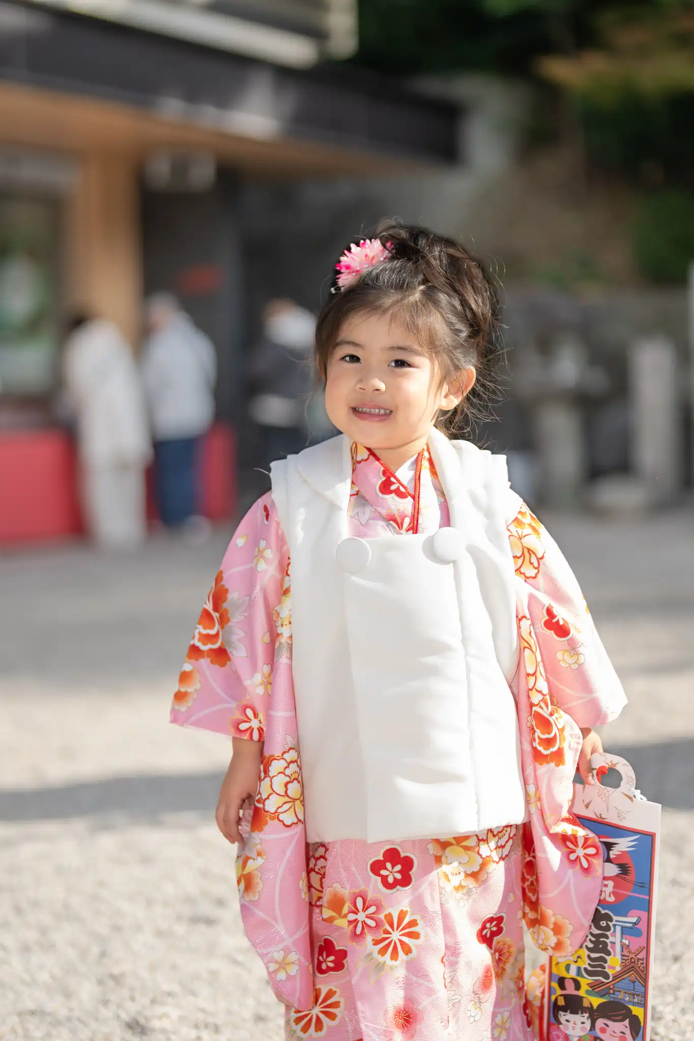 今回の主役は、淡いピンクの着物に白の被布を合わせた、やさしさと清楚さが際立つ三歳らしい七五三の装い。