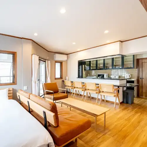 奥には仕切りが設けられ、前後で異なる時間を過ごせる構成となっており、それぞれを寝室として活用できるため最大4名様まで宿泊可能な機能性も兼ね備えています。
