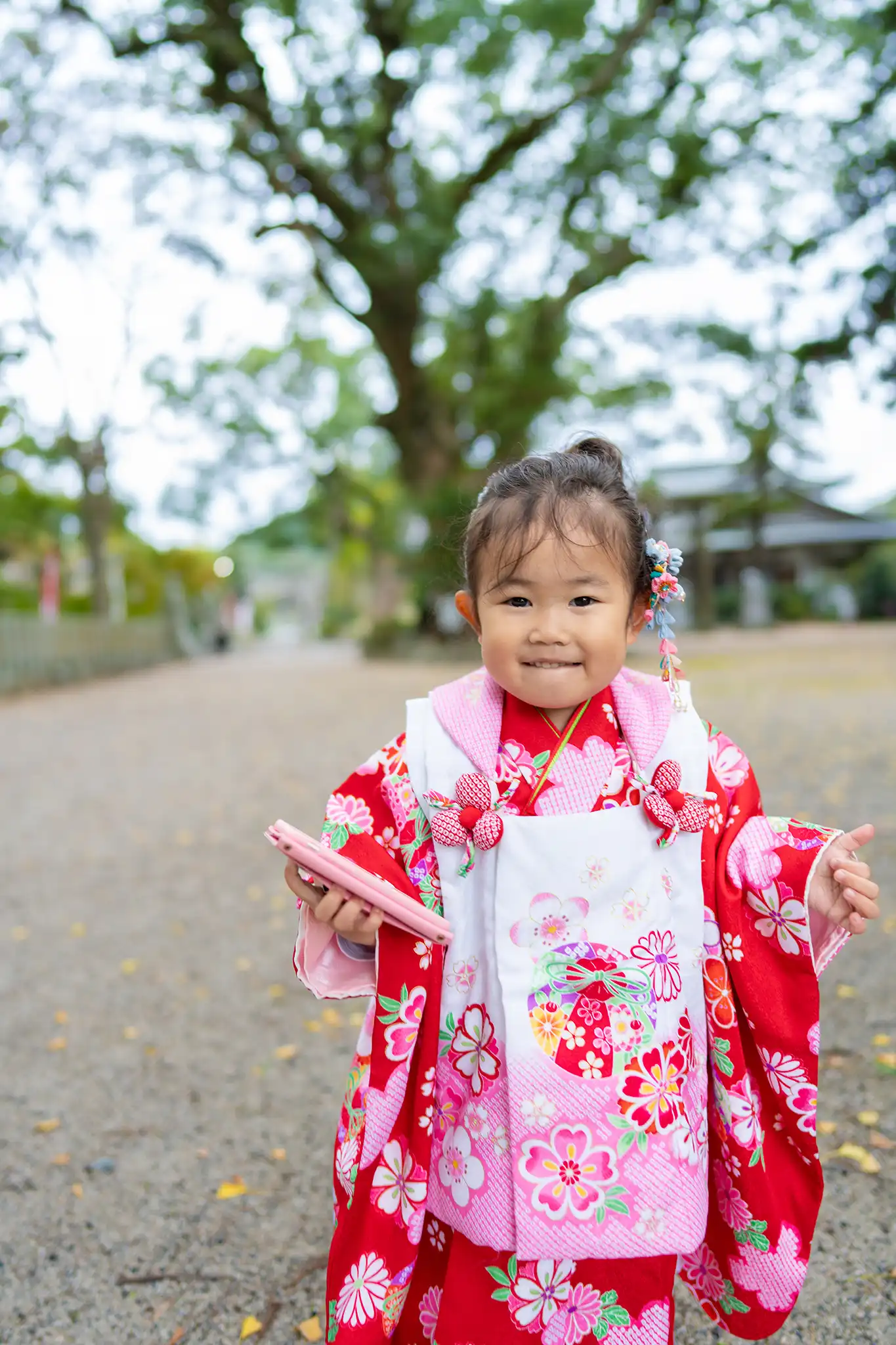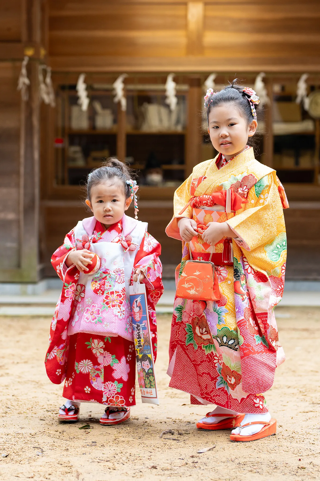 姉妹の7歳女子と3歳女子の撮影です。岡垣の高倉神社での撮影は、今回が初めての機会でした。境内は随所にスポットライトで照らされたような美しい光が差し込み、とても雰囲気のある神社でした。また、祈祷中の撮影が許可されているのも魅力的なポイントです。