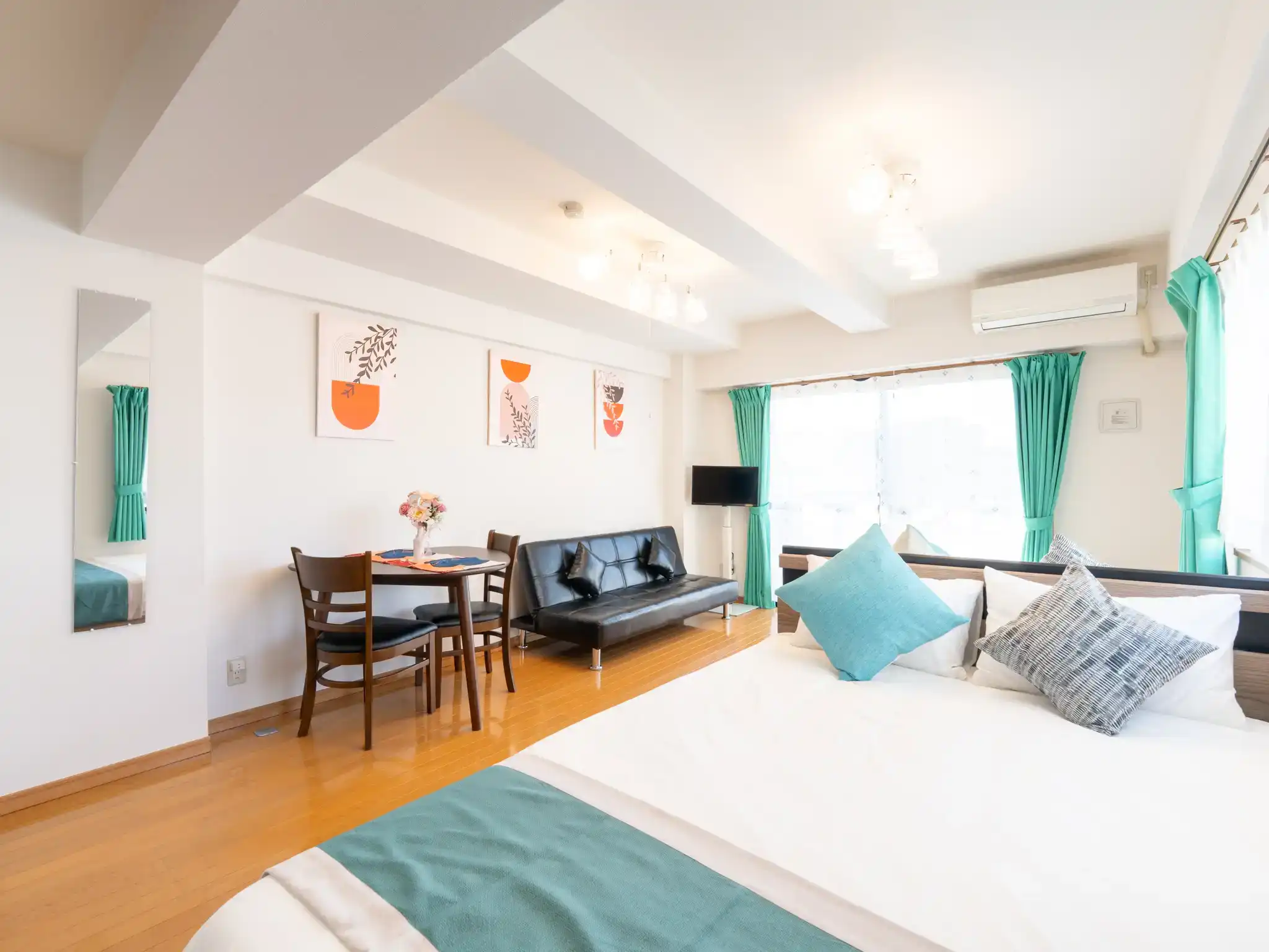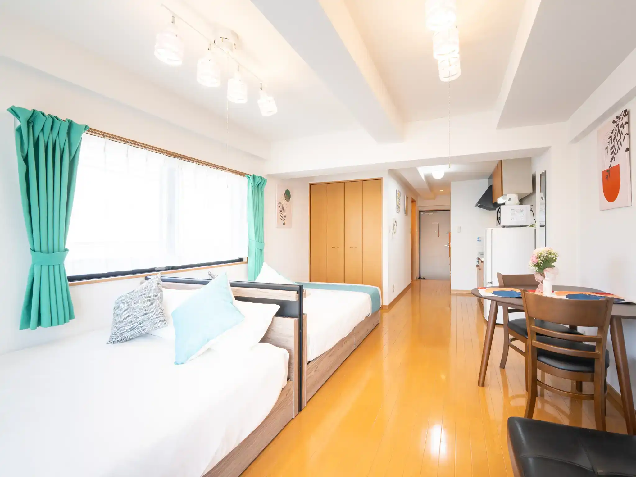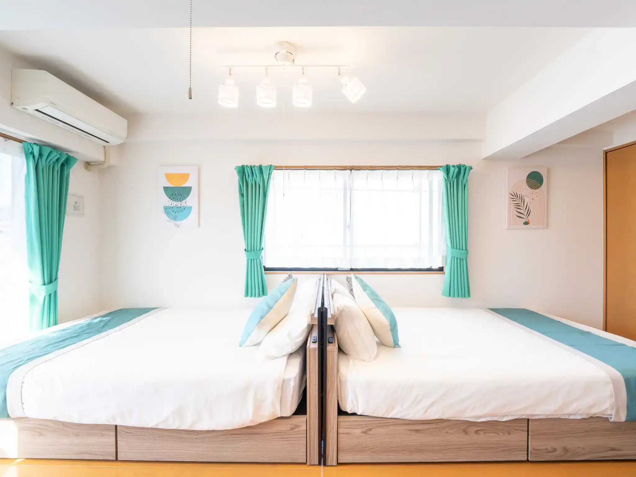 福岡市西区・愛宕の民泊物件を撮影させていただきましたが、扉を開けた瞬間に広がるティファニーブルーの世界観に、思わず心がときめくお部屋でした。