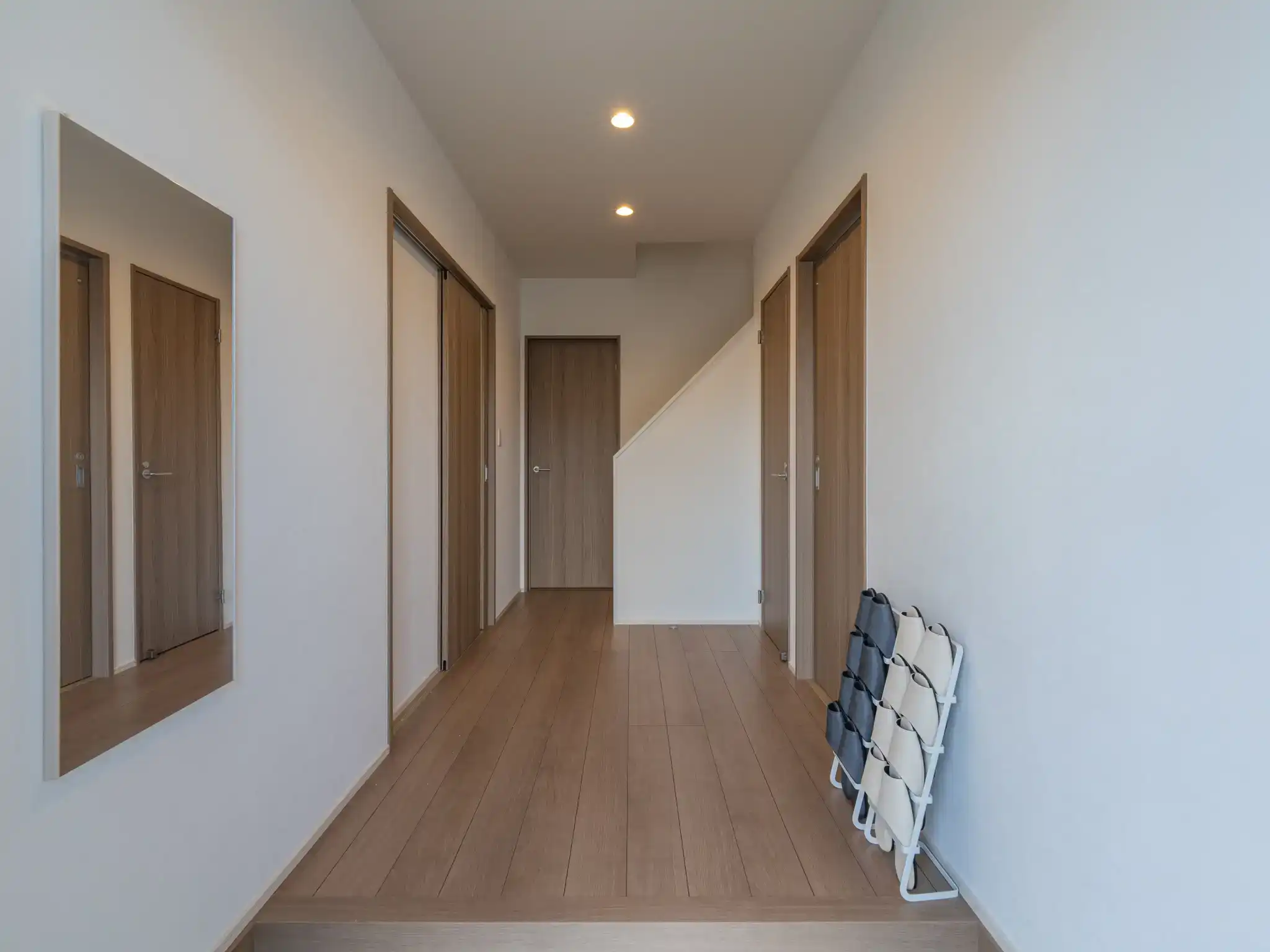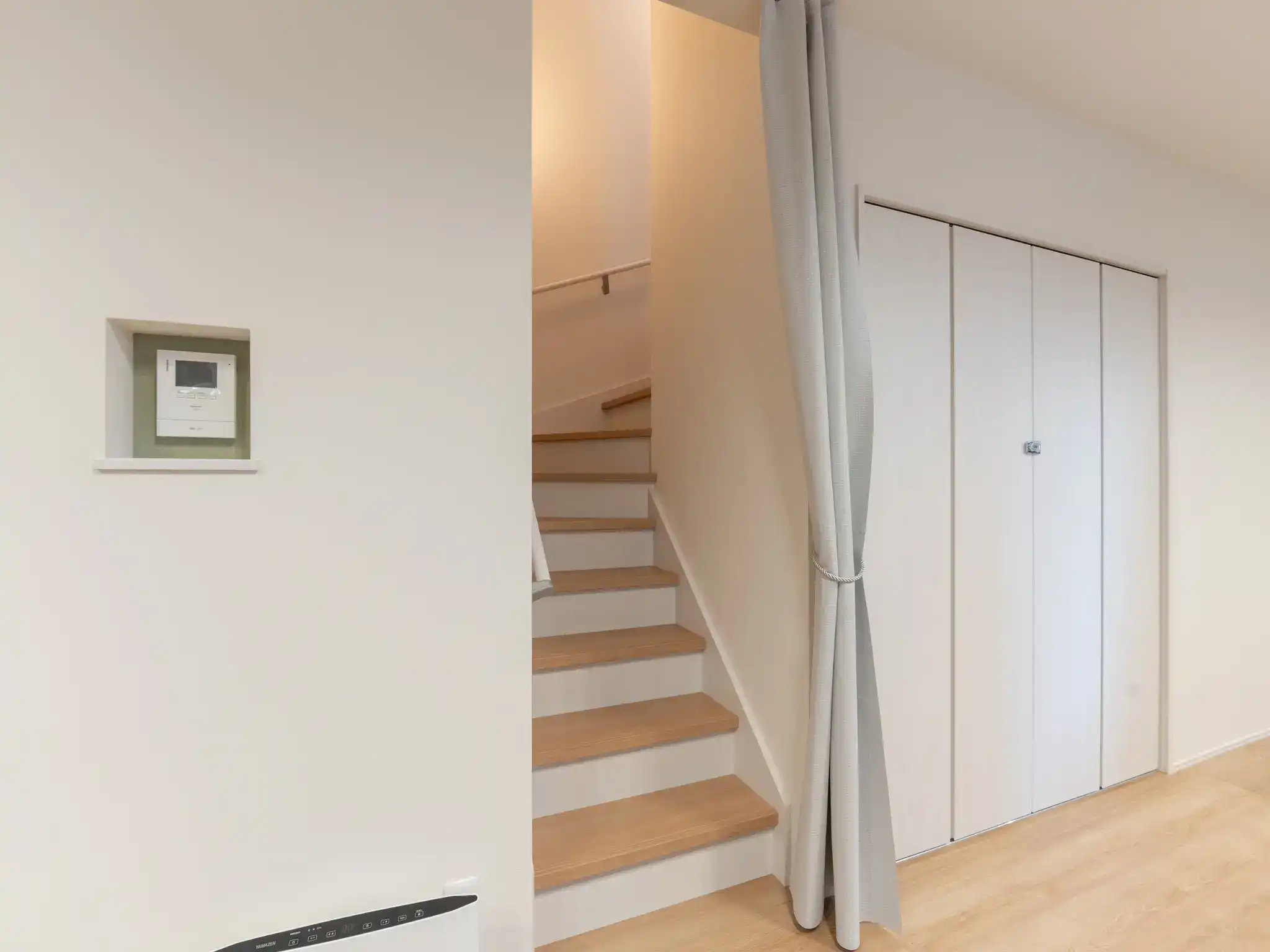 3階にはフローリングの洋室があり、その背中合わせに続きの和室が配置された広々とした構成で、遮光性のある印象的なカーテンを活かし、昼間の撮影ながら夜と昼それぞれの表情を演出しました。