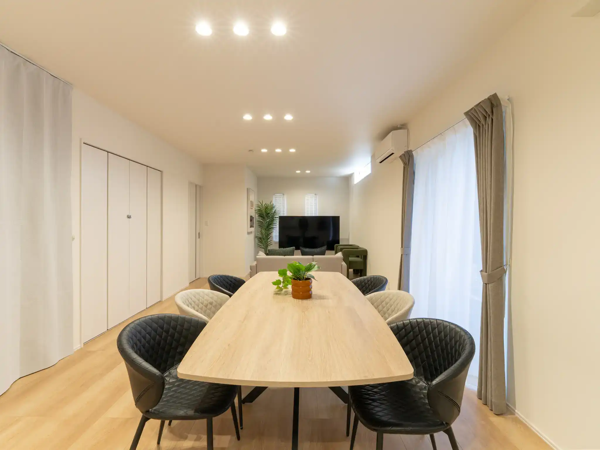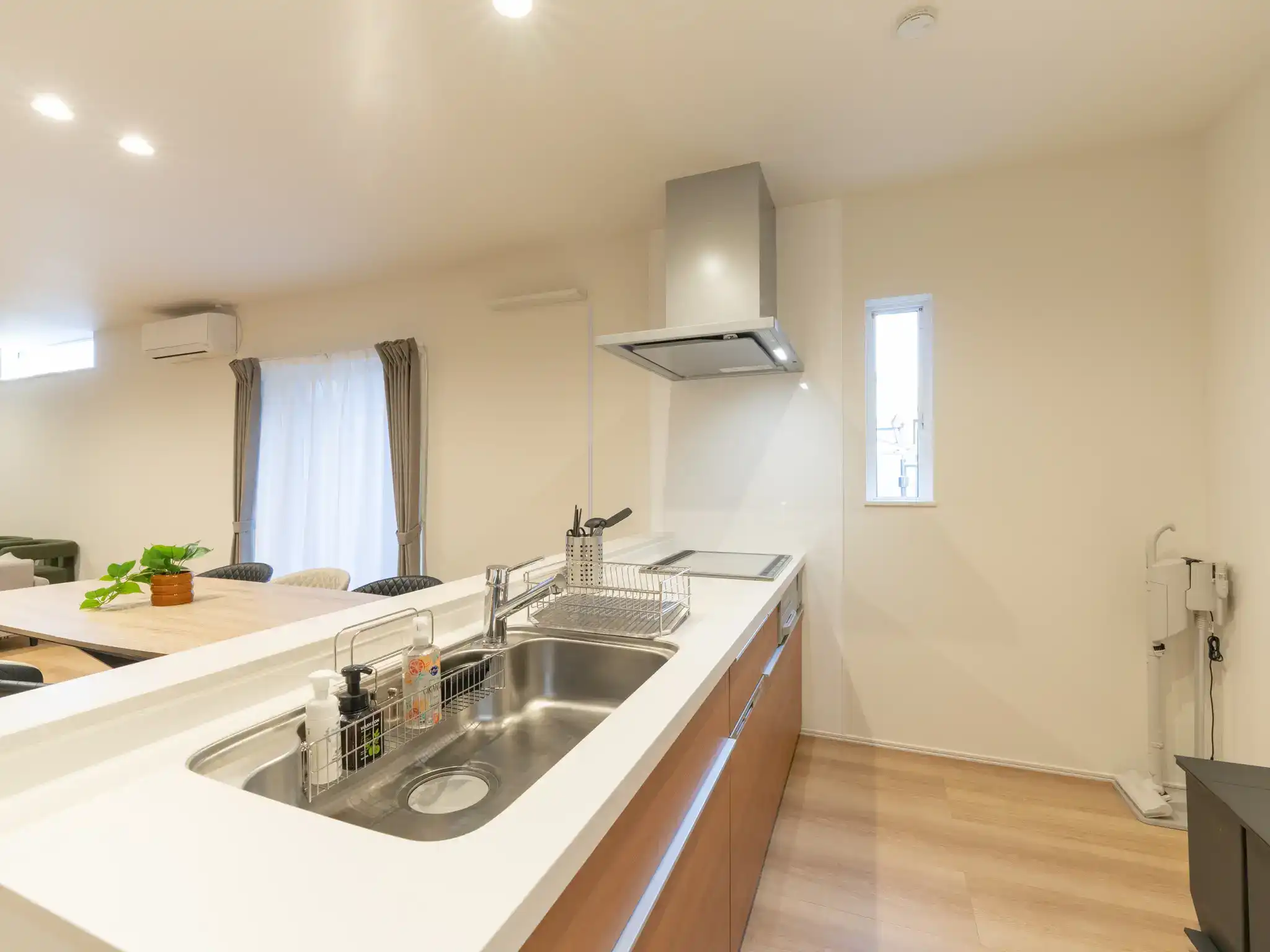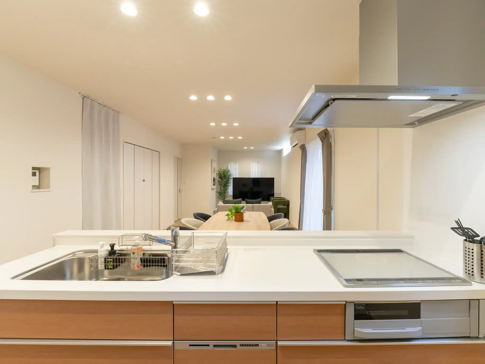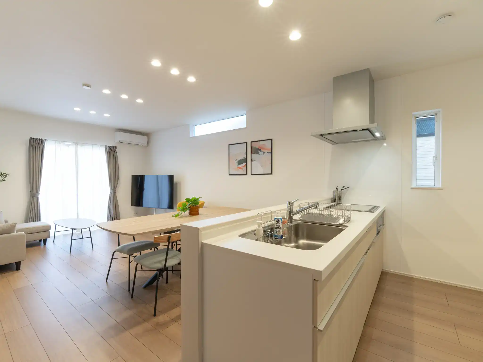 同じく唐津城の近くに建つ新築一棟貸しの民泊ですが、こちらは先の物件よりもTVとキッチンの距離がぐっと近く、家族の気配を感じながら過ごせる一体感のあるリビングが印象的でした。
