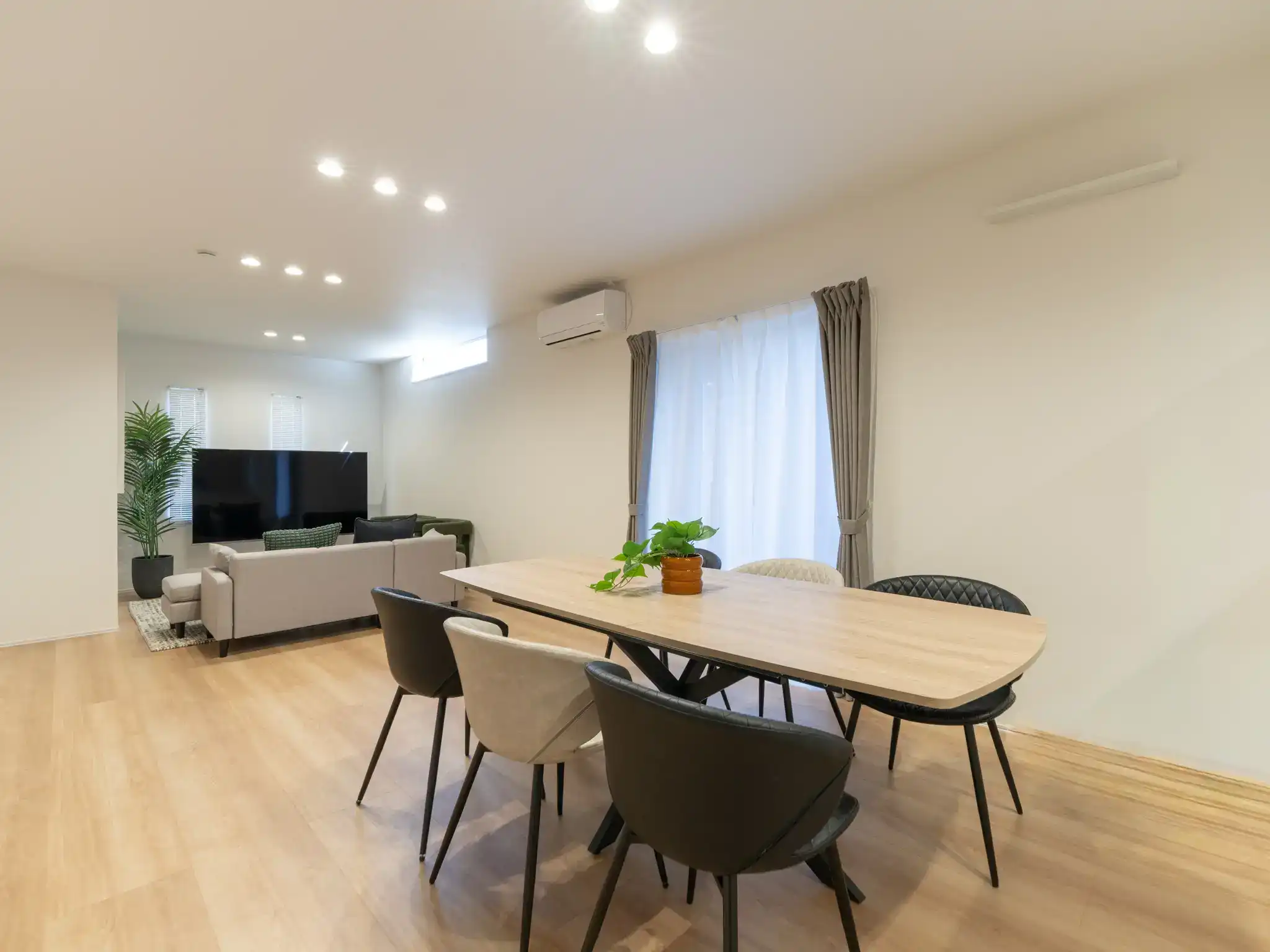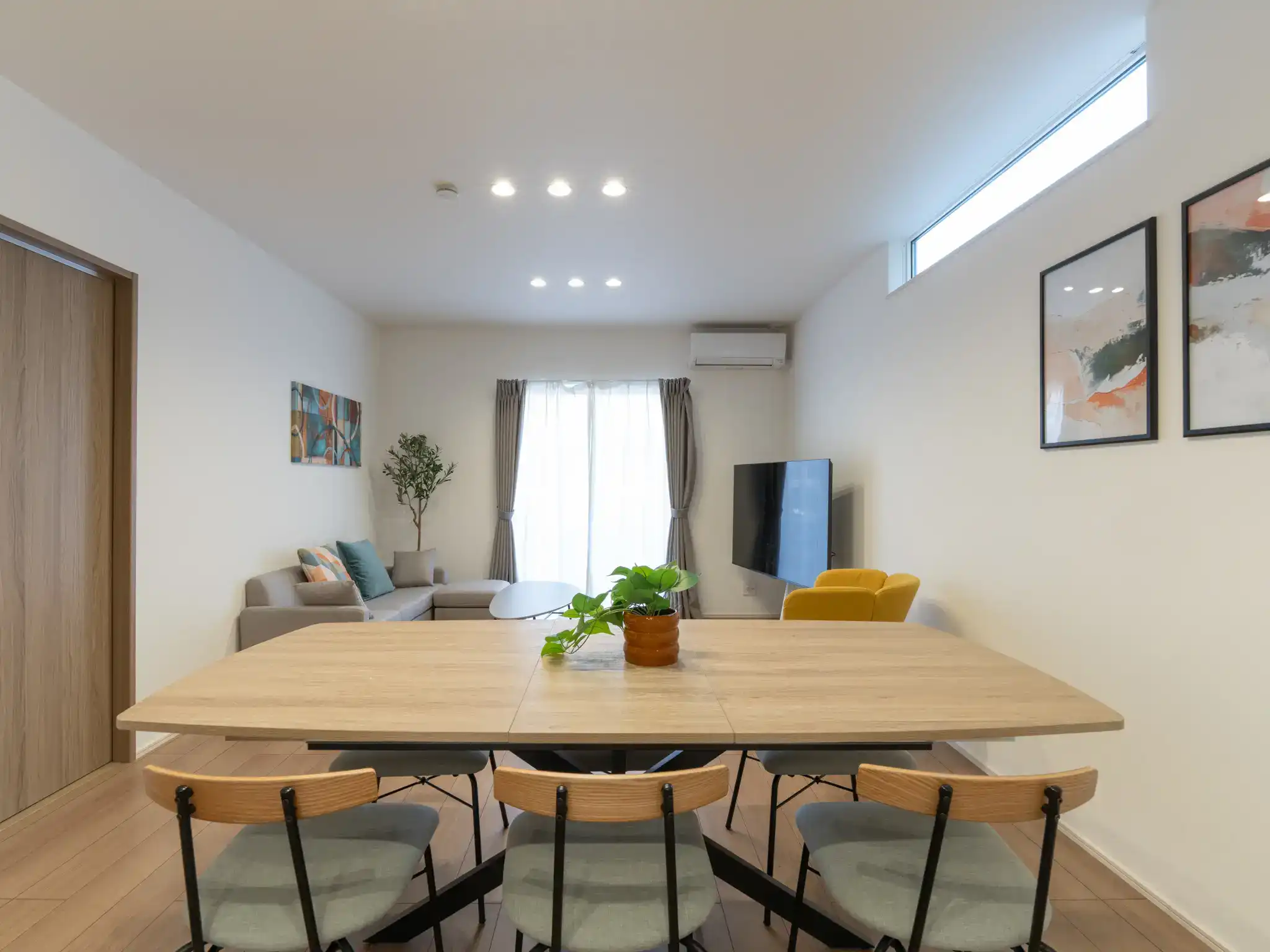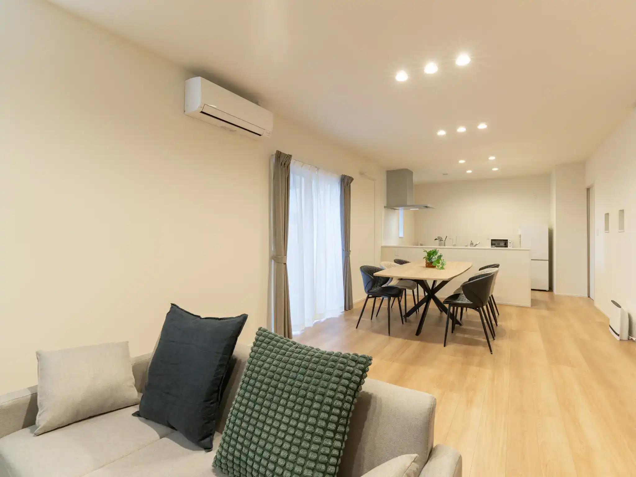 同じく唐津城の近くに建つ新築一棟貸しの民泊ですが、こちらは先の物件よりもTVとキッチンの距離がぐっと近く、家族の気配を感じながら過ごせる一体感のあるリビングが印象的でした。