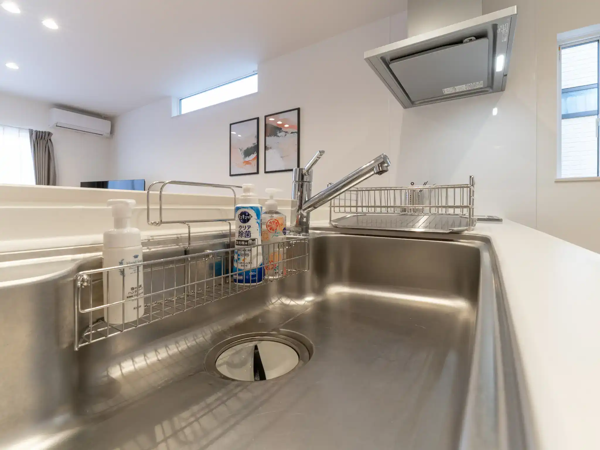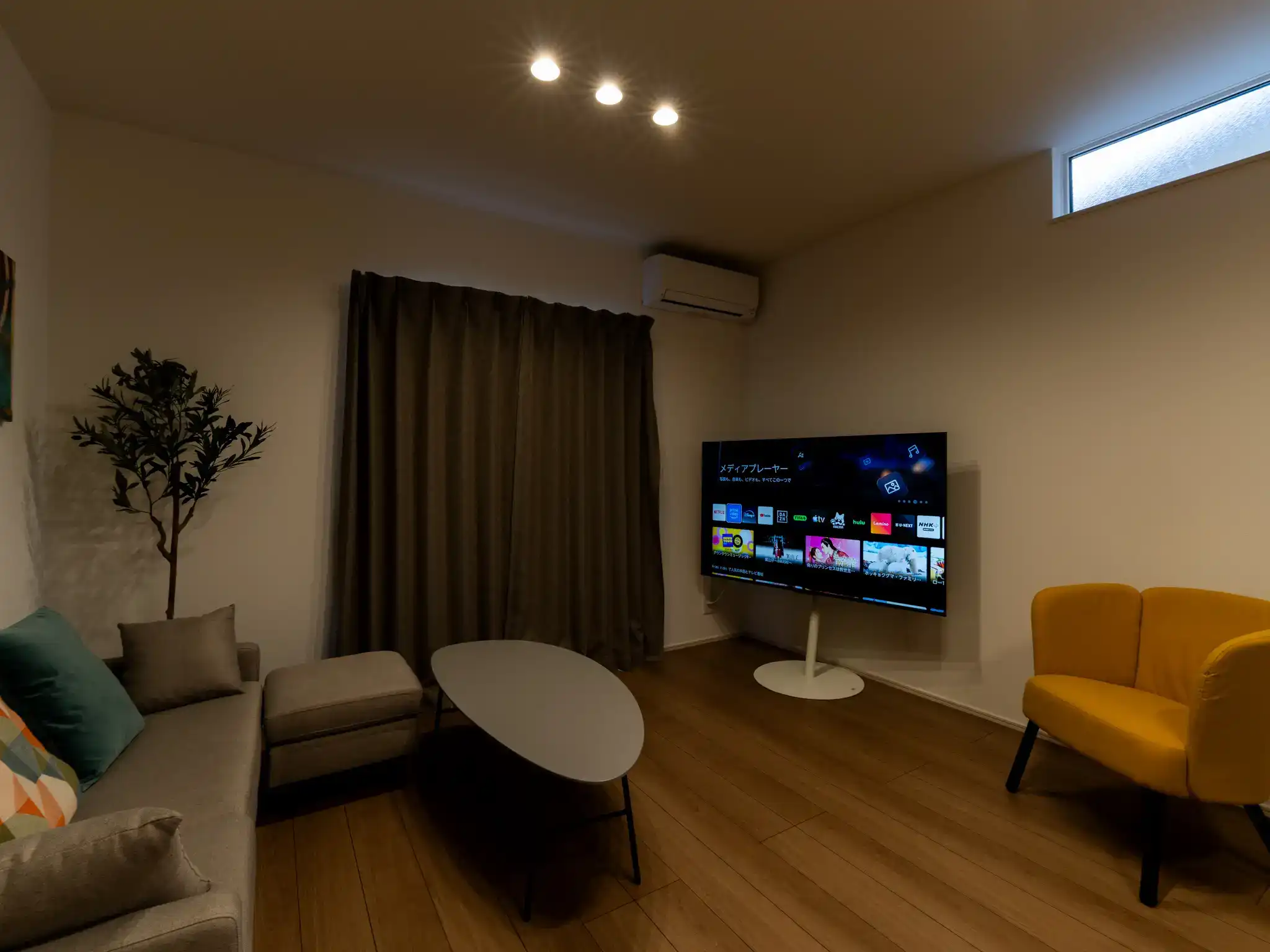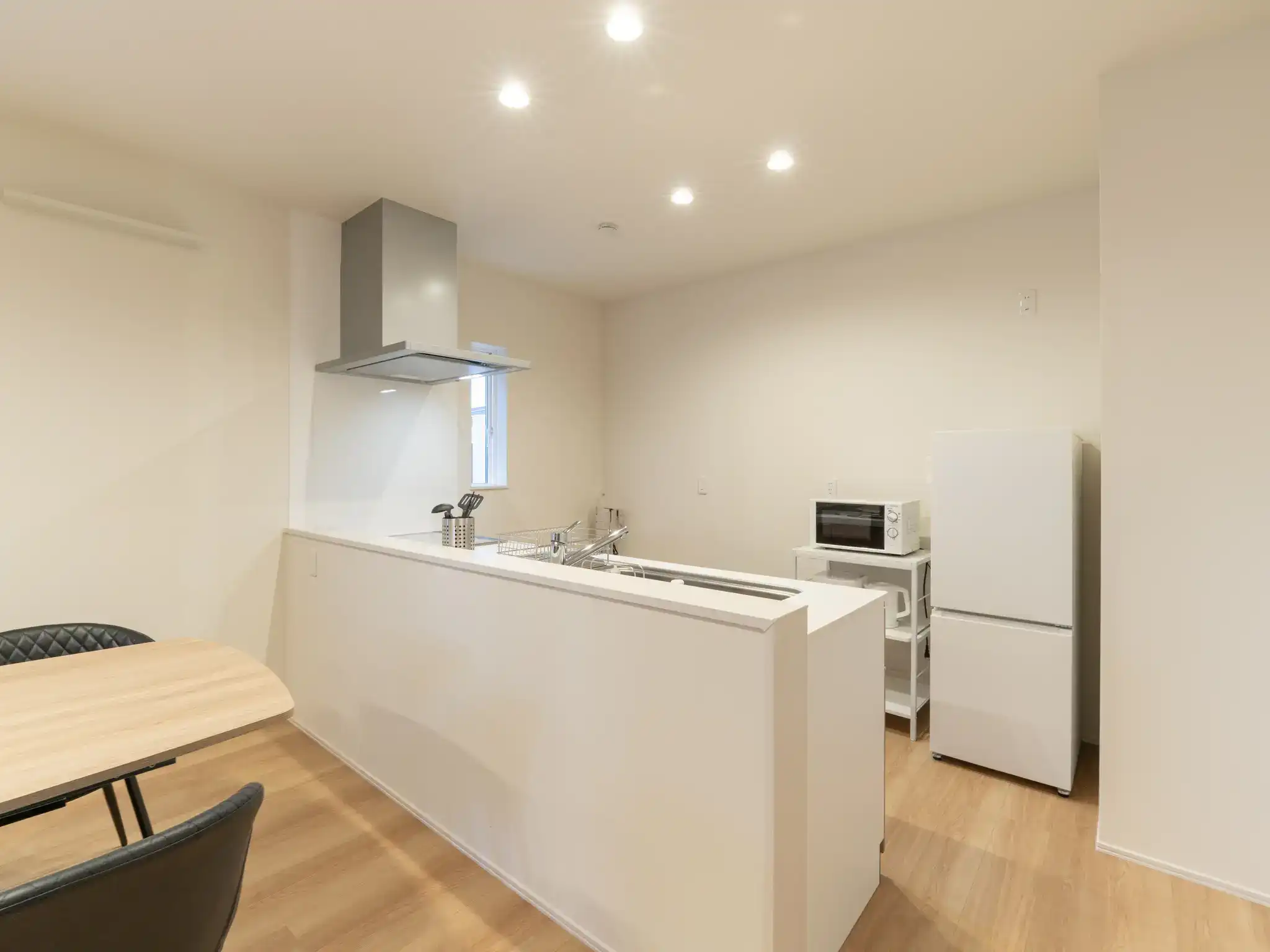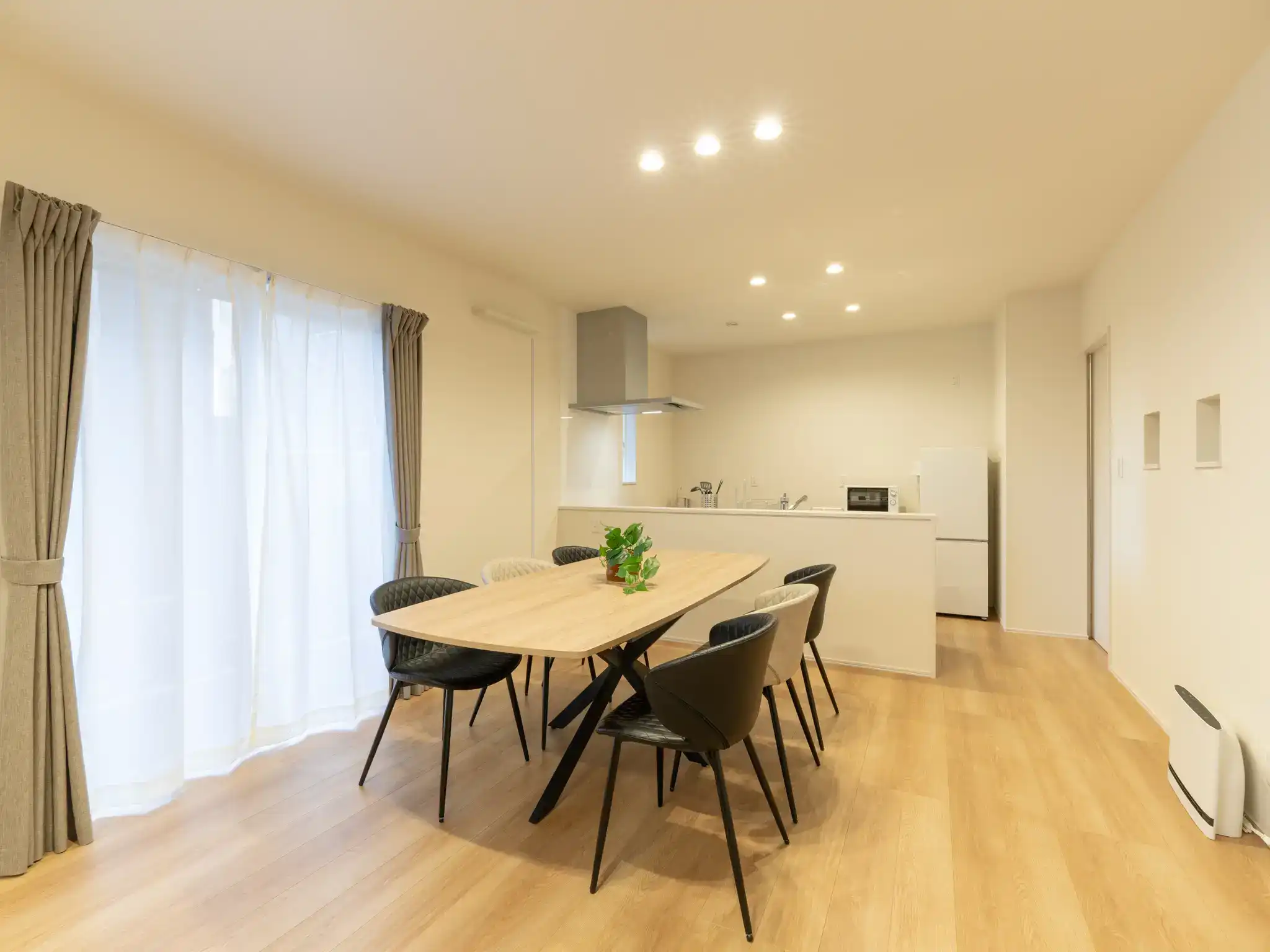 同じく唐津城の近くに建つ新築一棟貸しの民泊ですが、こちらは先の物件よりもTVとキッチンの距離がぐっと近く、家族の気配を感じながら過ごせる一体感のあるリビングが印象的でした。