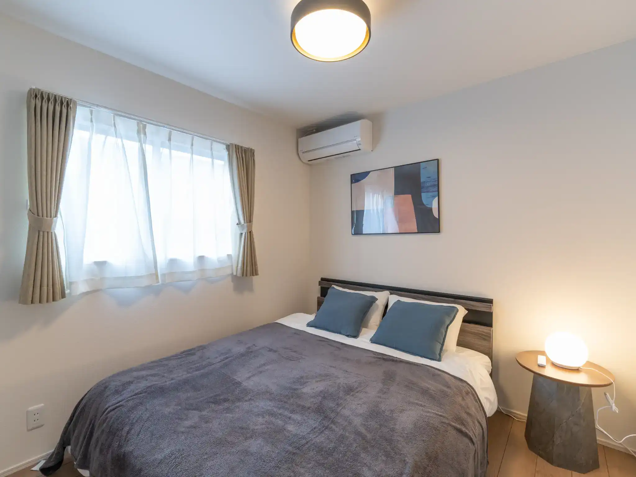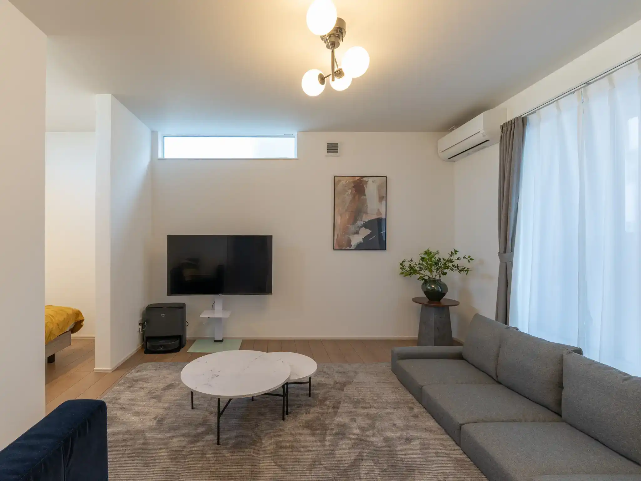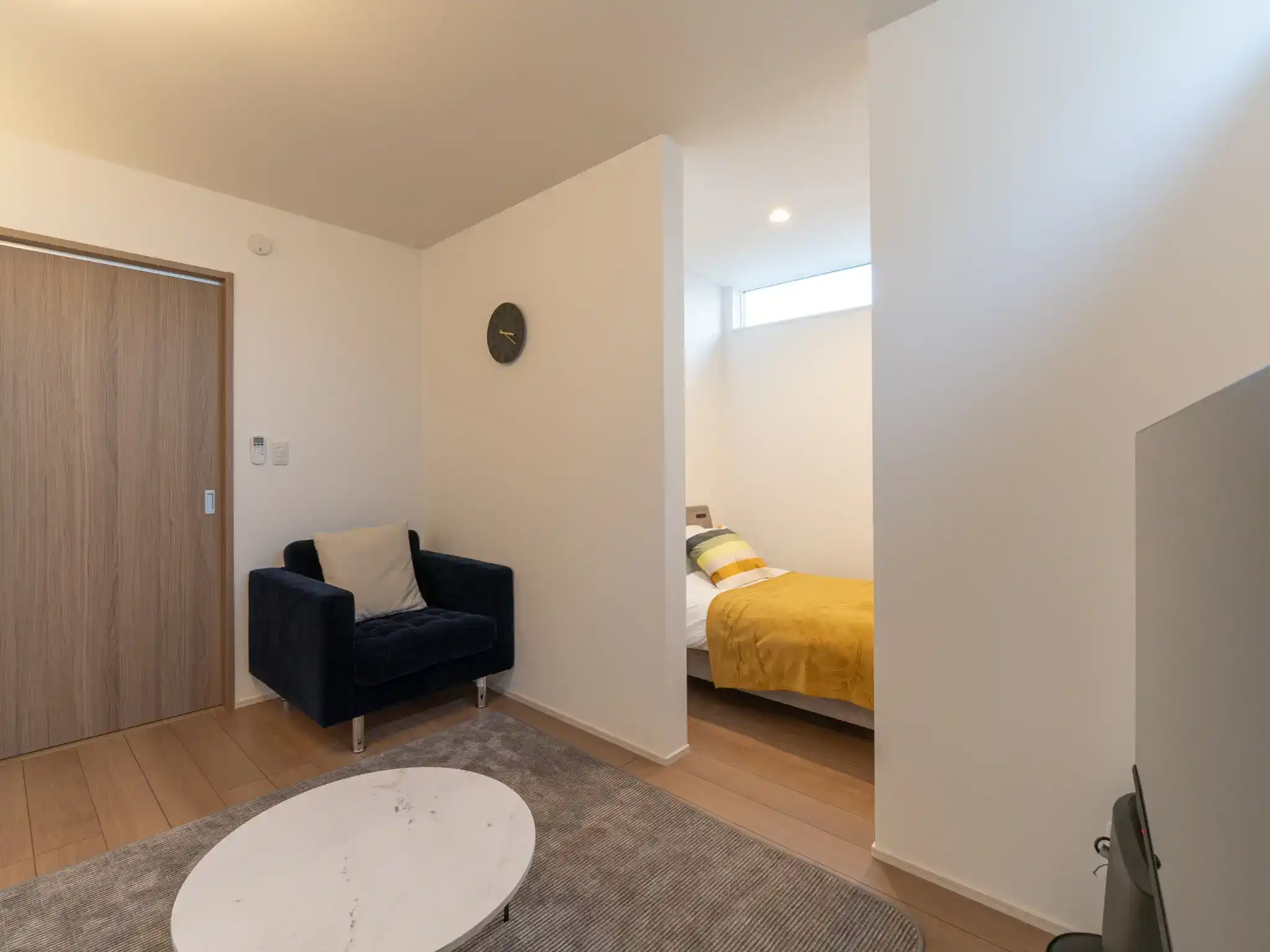 奥には仕切りが設けられ、前後で異なる時間を過ごせる構成となっており、それぞれを寝室として活用できるため最大4名様まで宿泊可能な機能性も兼ね備えています。