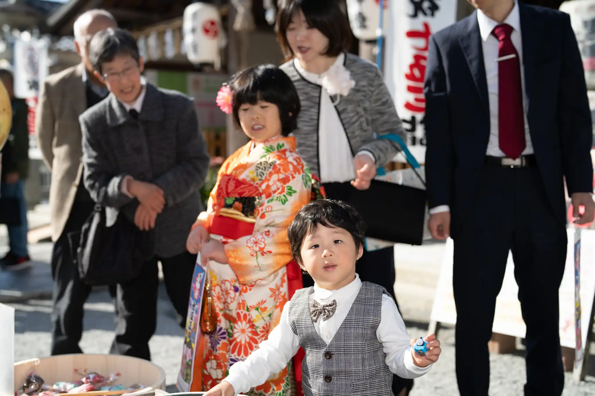 飯塚市の曩祖八幡宮にて、7歳の女の子と3歳の男の子の七五三撮影を行いました。