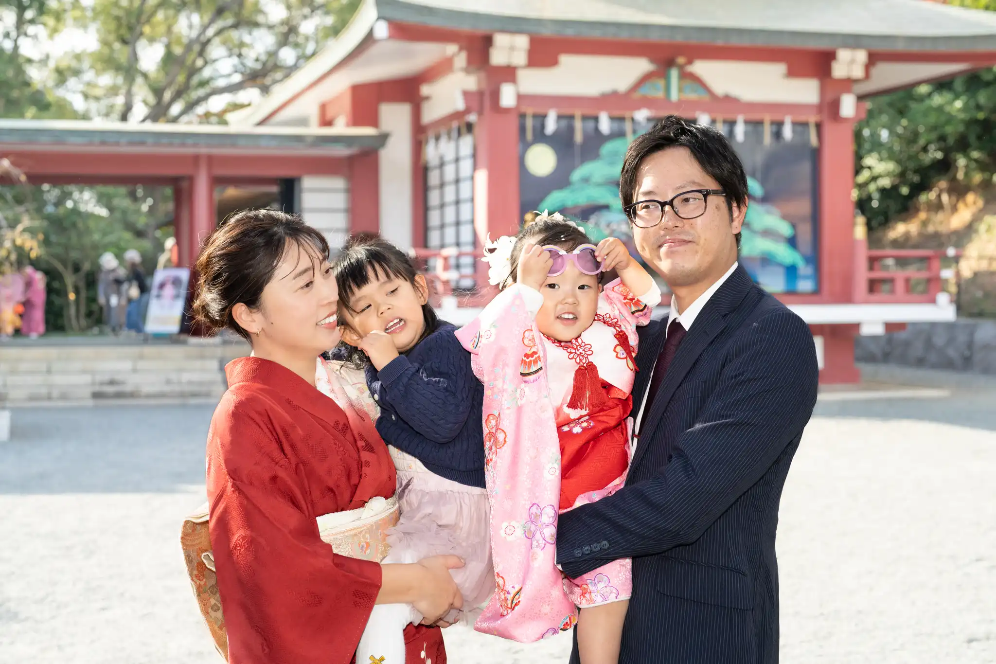 福岡県北九州市小倉北区の篠崎八幡神社にて、3歳の女の子と4歳のお姉ちゃんの七五三撮影を行いました。