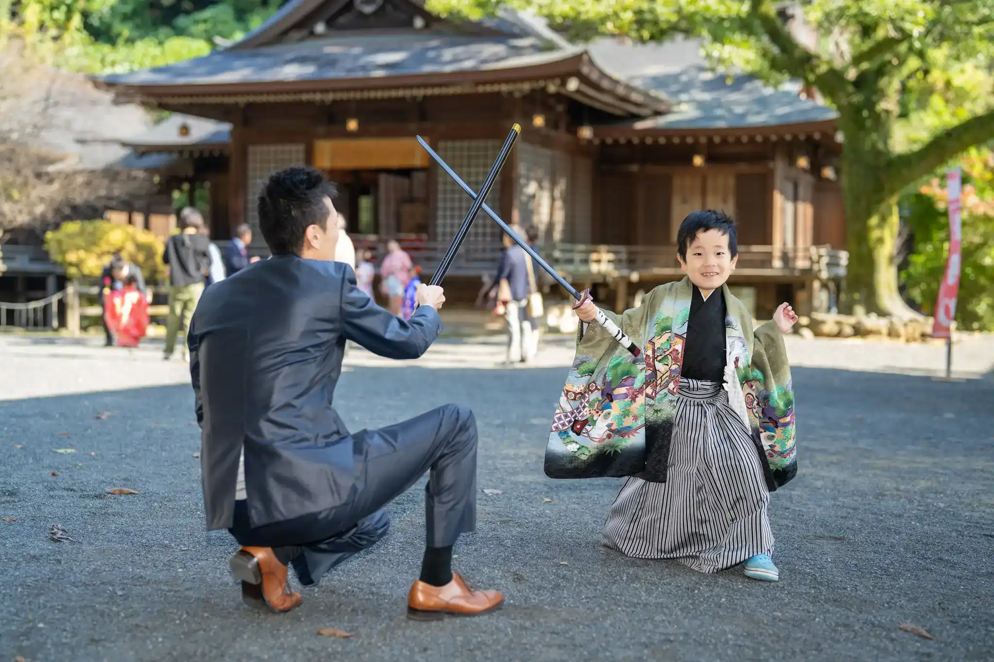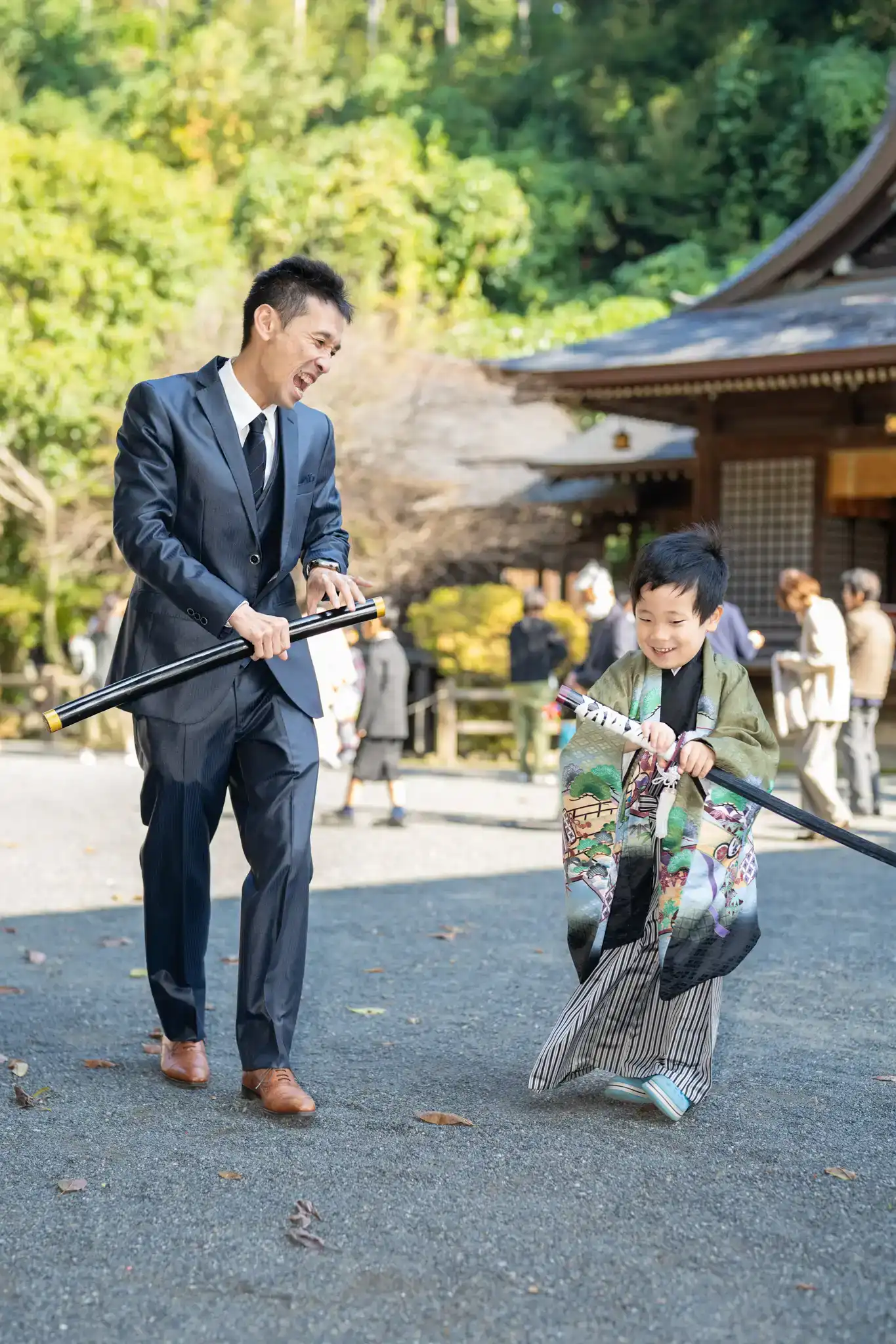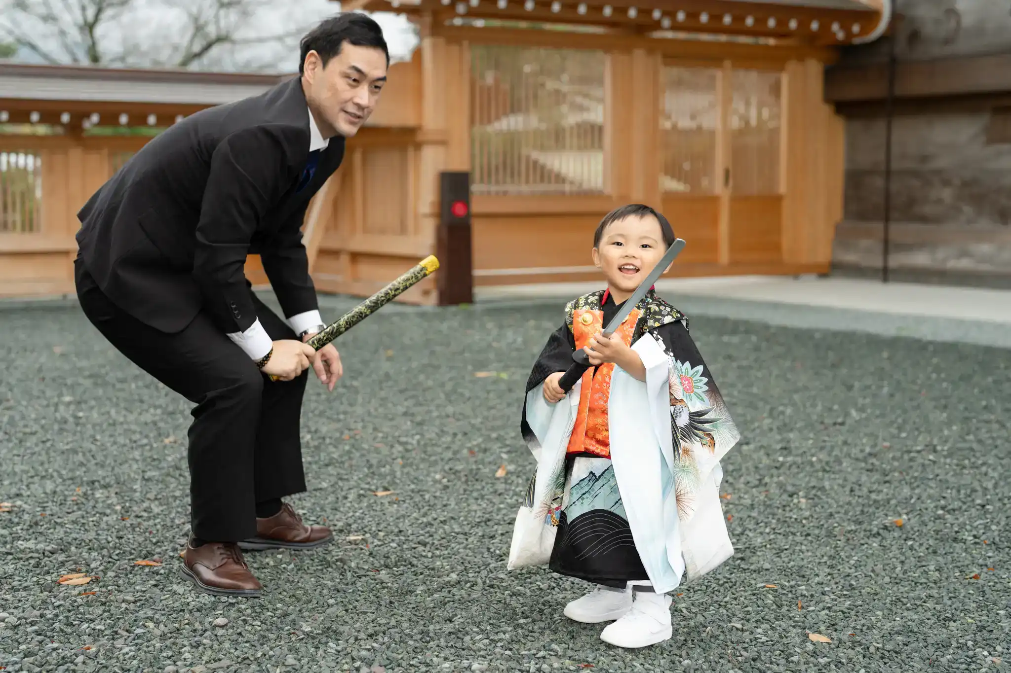男の子たちはお父さんとのチャンバラ遊びに夢中で、お父さんも思わず本気モード。