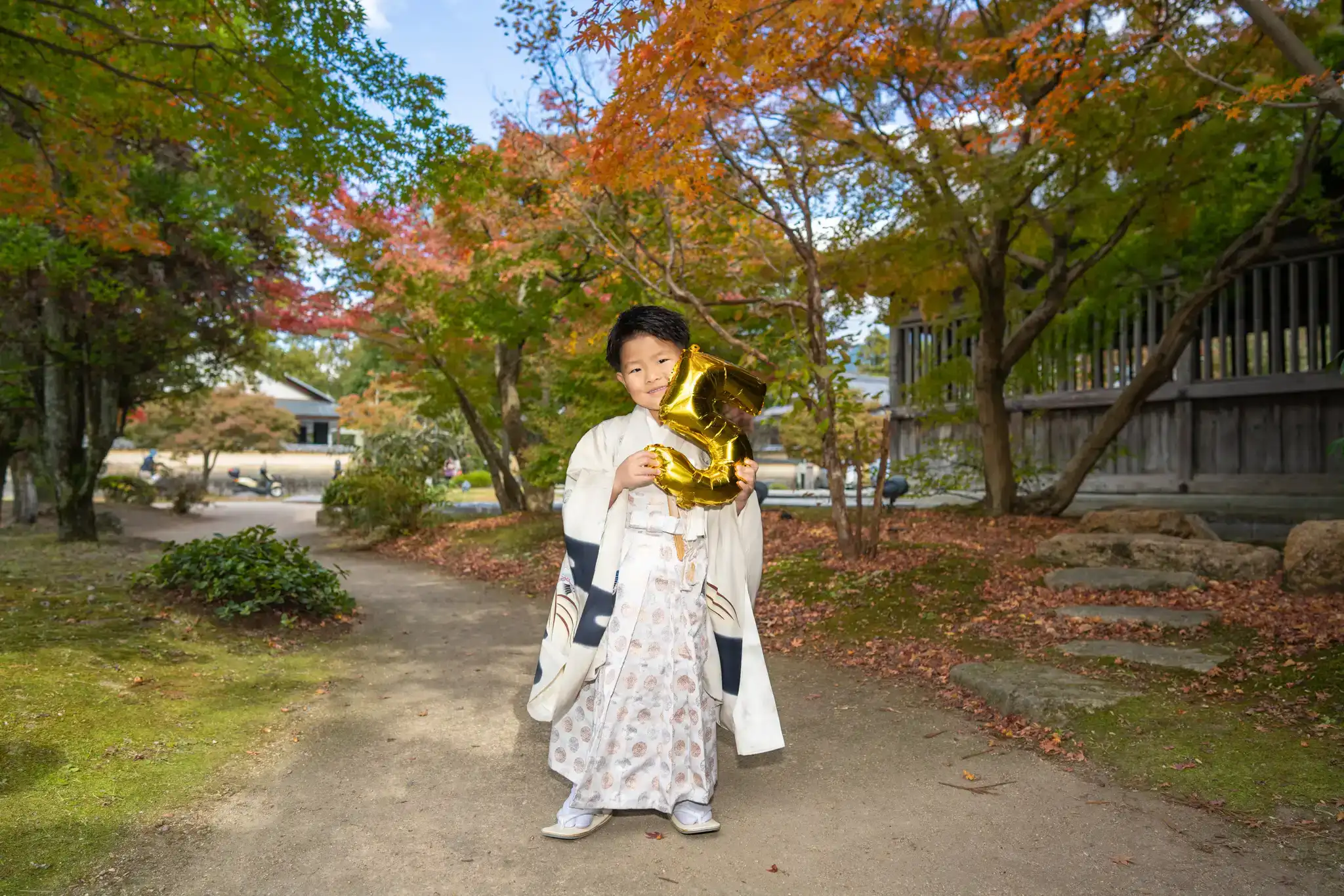 7歳の女の子は、白地に橙を基調とした古典柄が映える、上品さと華やかさを兼ね備えた七五三らしい一着。