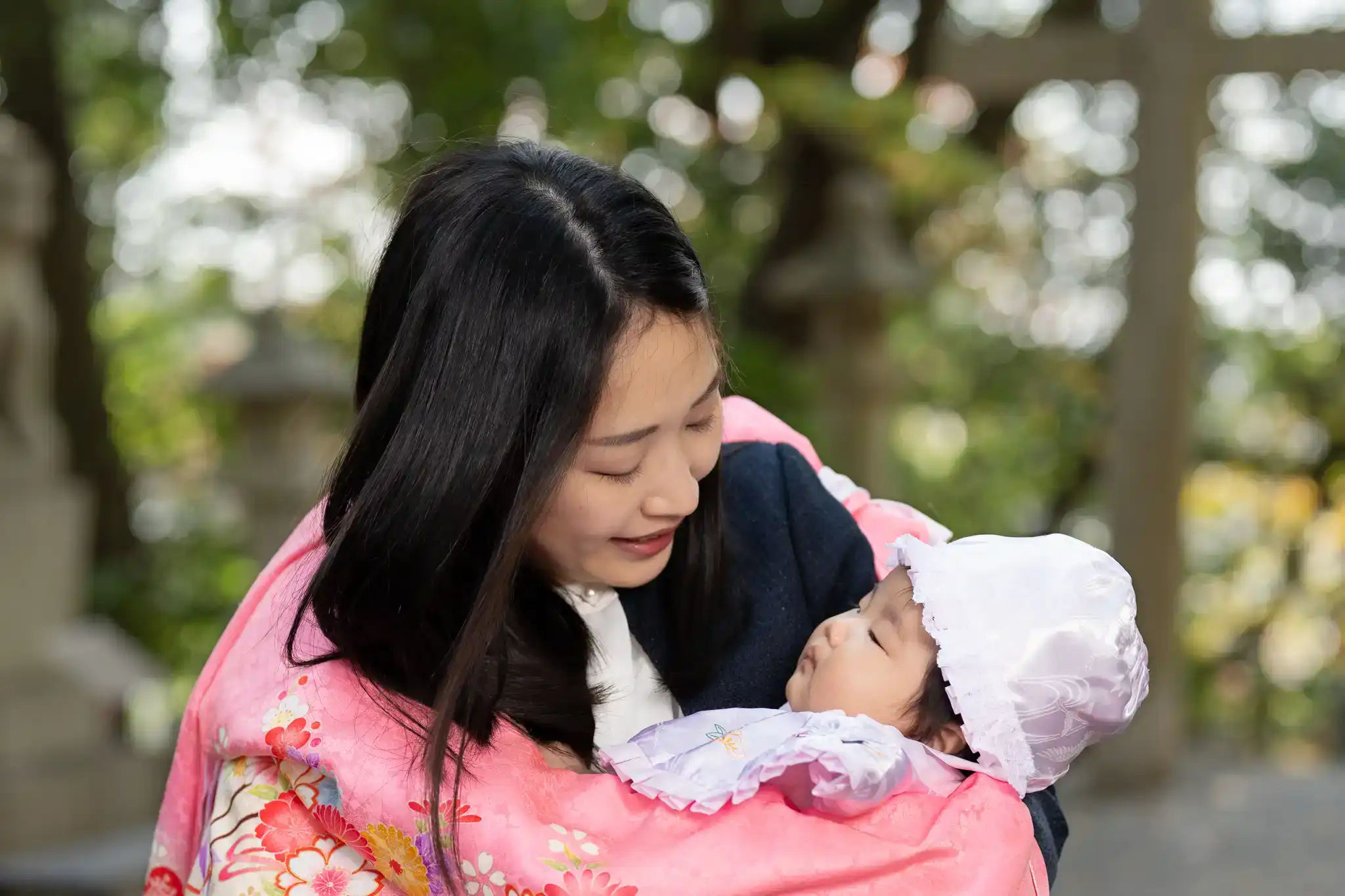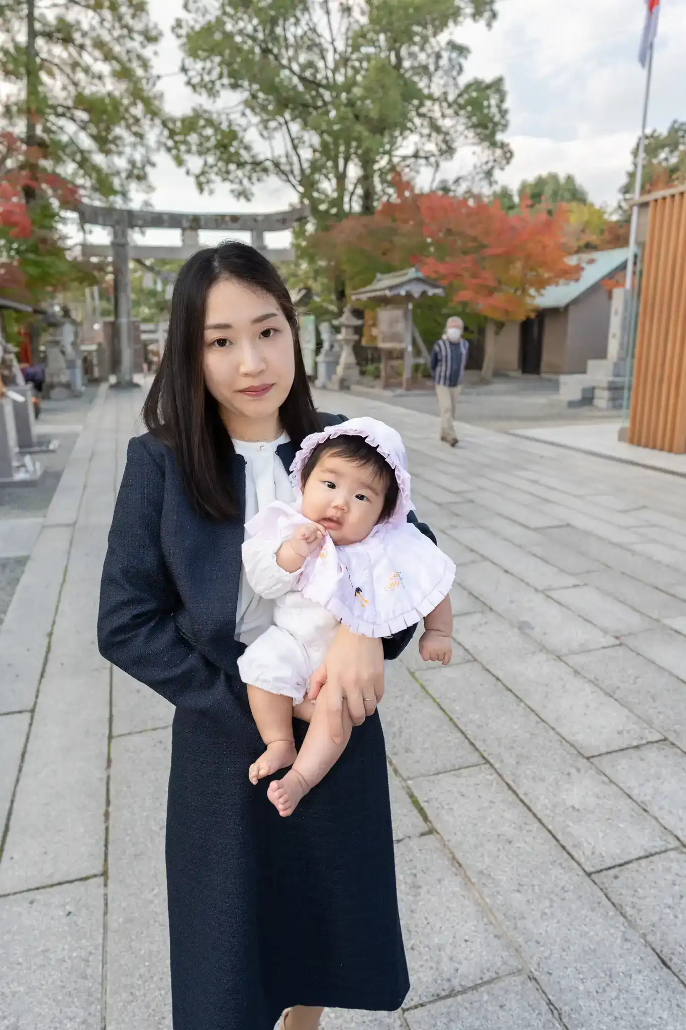 お宮参りの赤ちゃんは、眠っていることが多い中、この日はしっかり目線をくれる場面も。