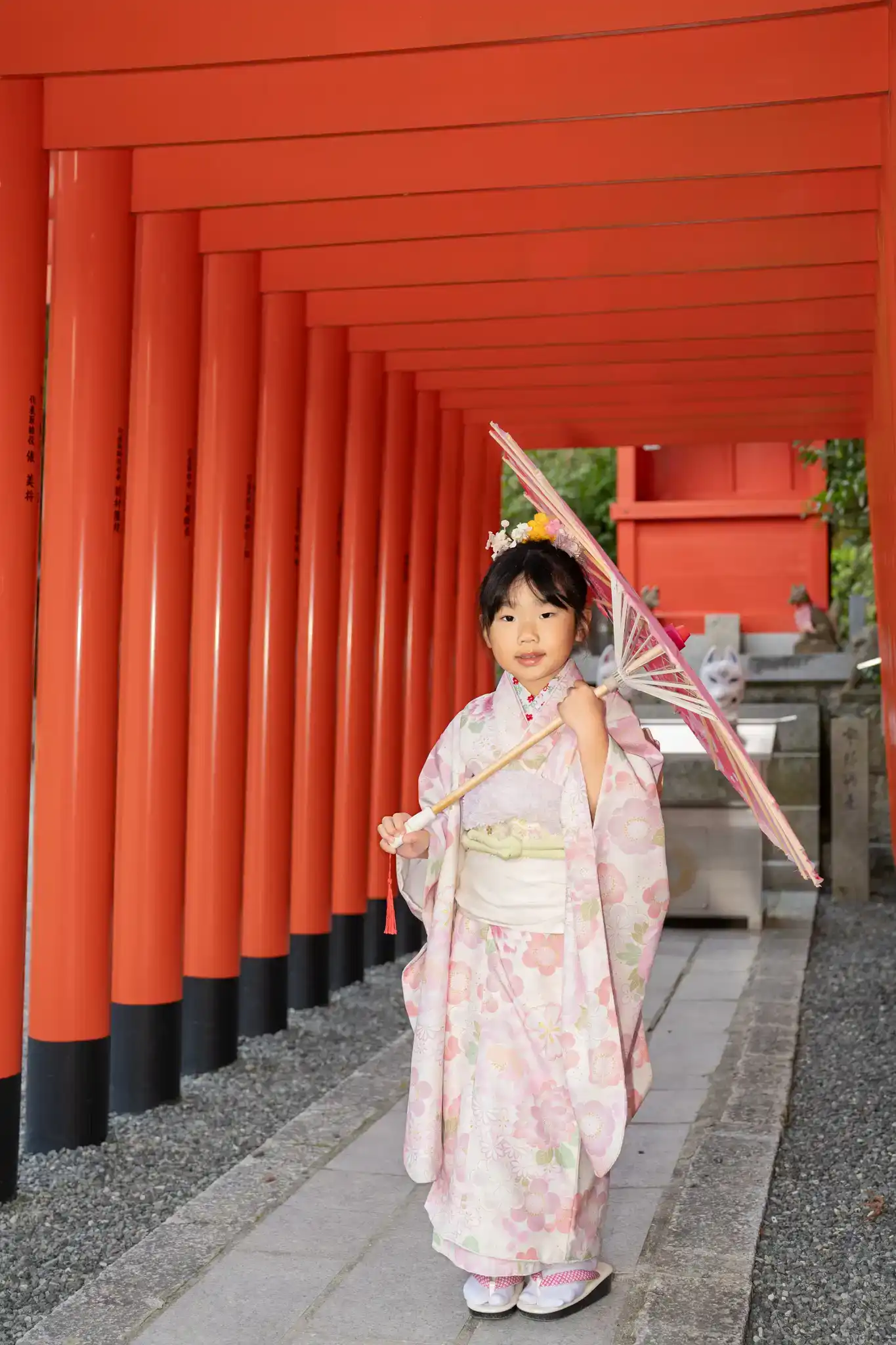女の子はやっぱり和傘がよく似合い、弊社でご用意している小物も活躍。