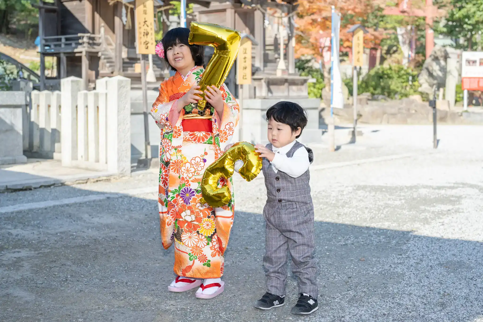 飯塚市の曩祖八幡宮にて、7歳の女の子と3歳の男の子の七五三撮影を行いました。