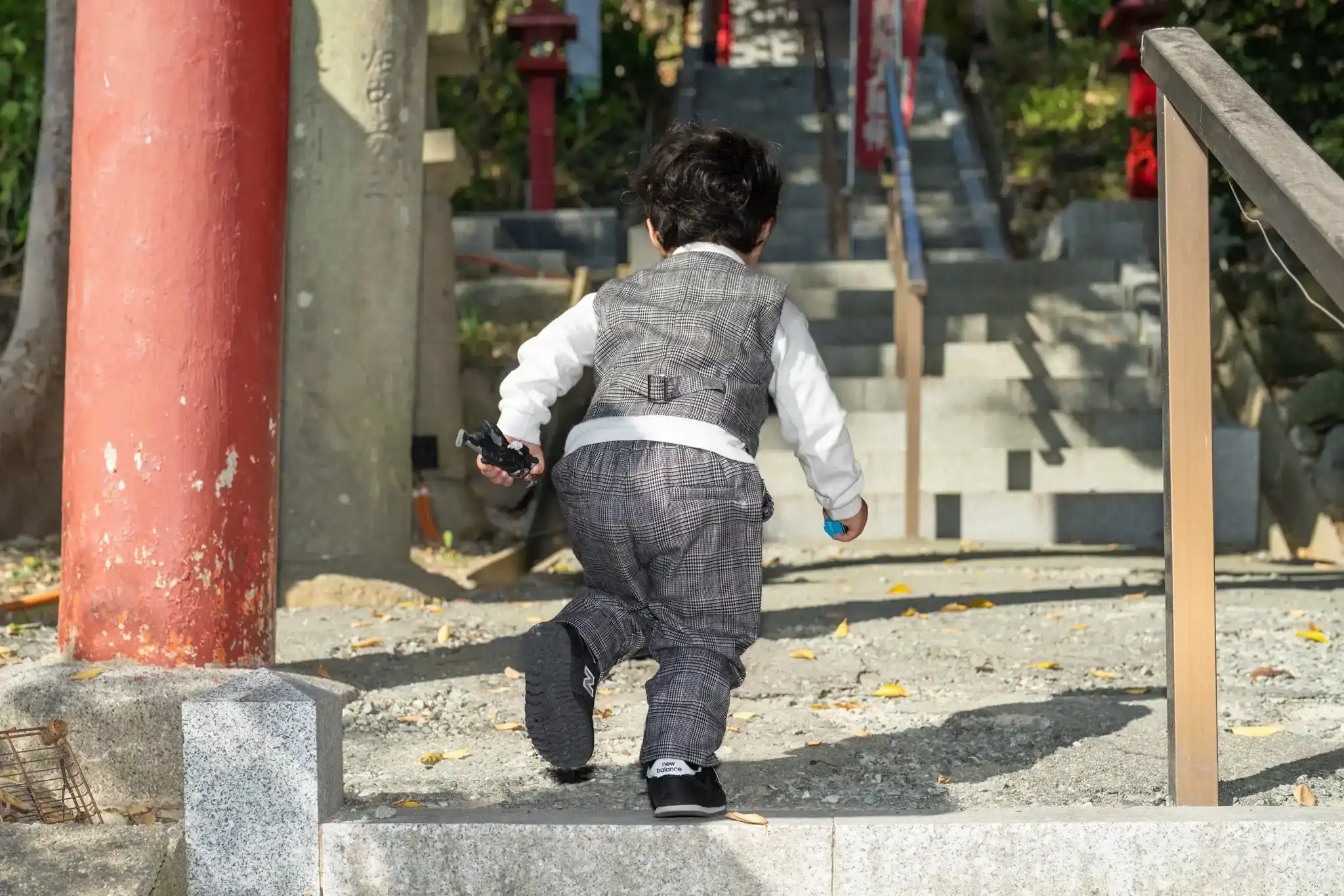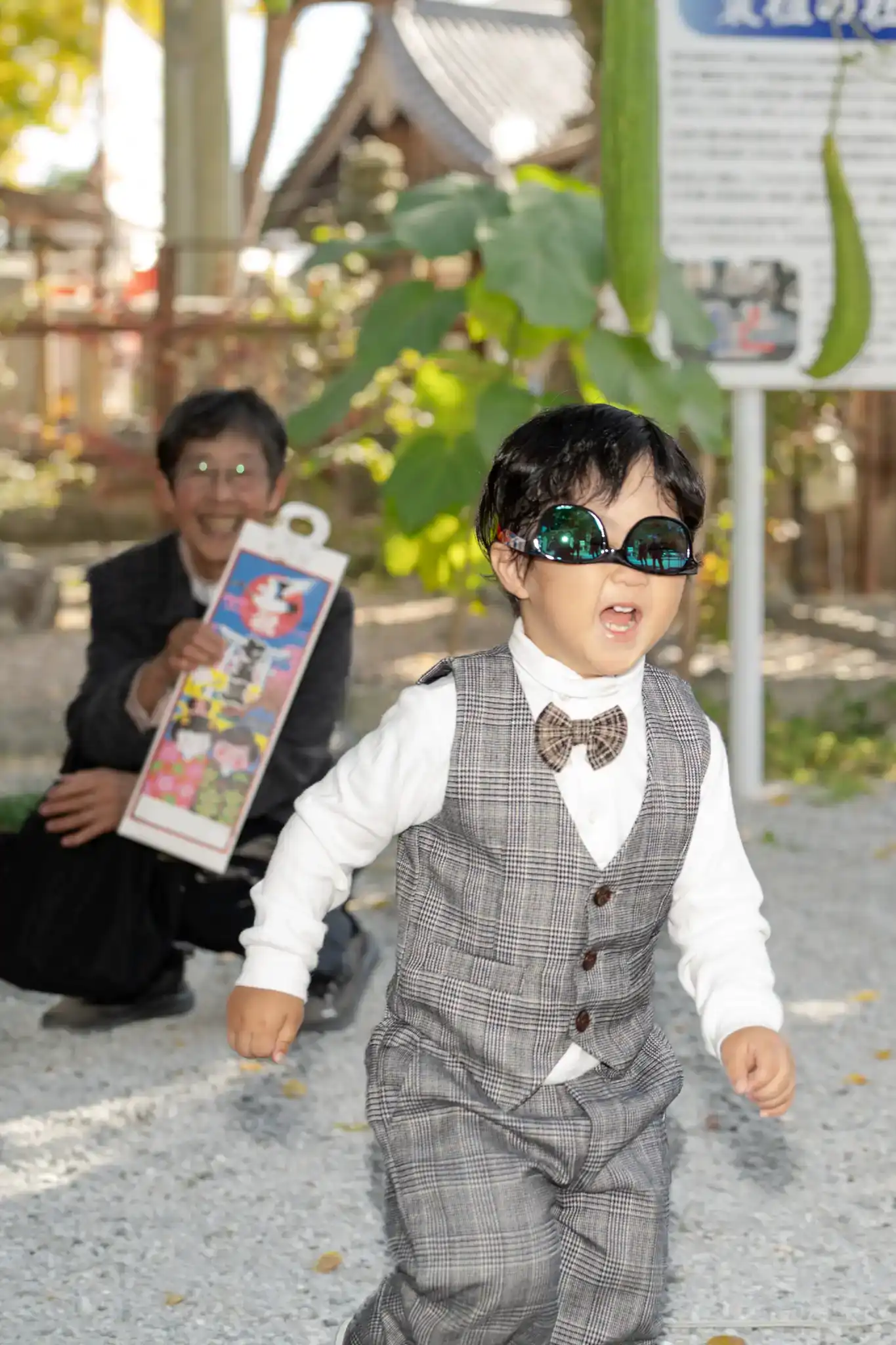 3歳の男の子は、チェック柄のベストとパンツを合わせた装いで、自然な可愛らしさが印象的でした。