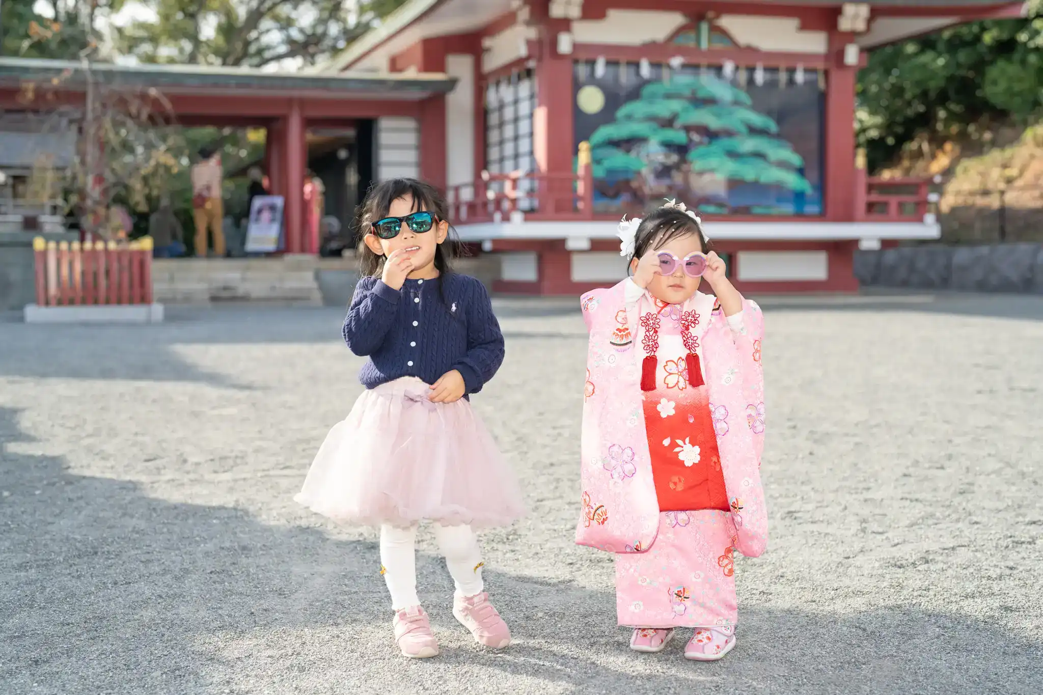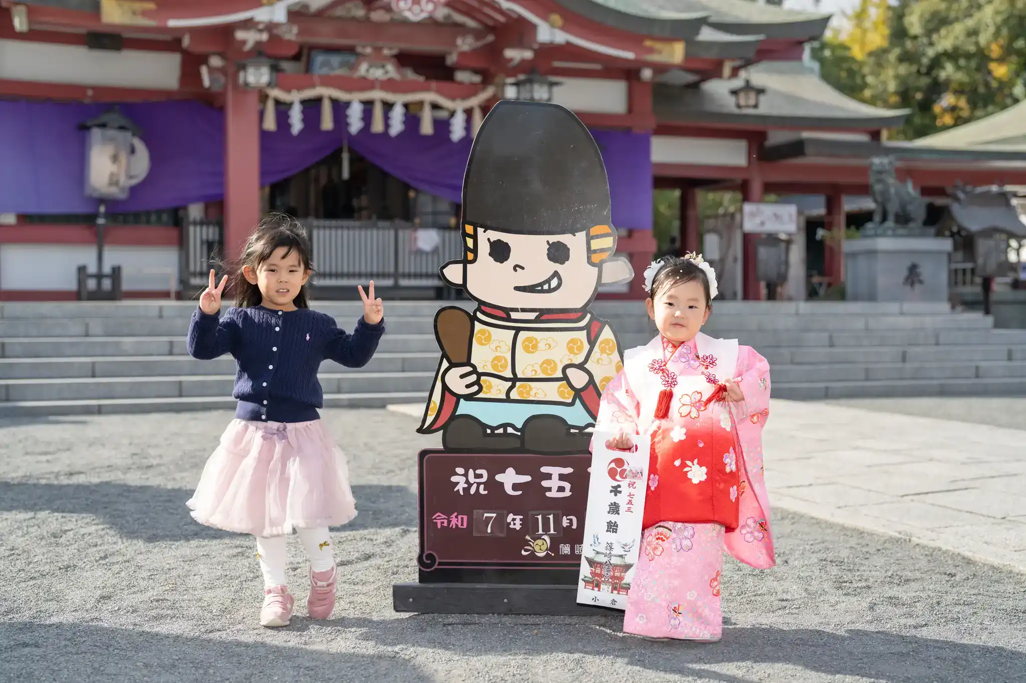 福岡県北九州市小倉北区の篠崎八幡神社にて、3歳の女の子と4歳のお姉ちゃんの七五三撮影を行いました。
