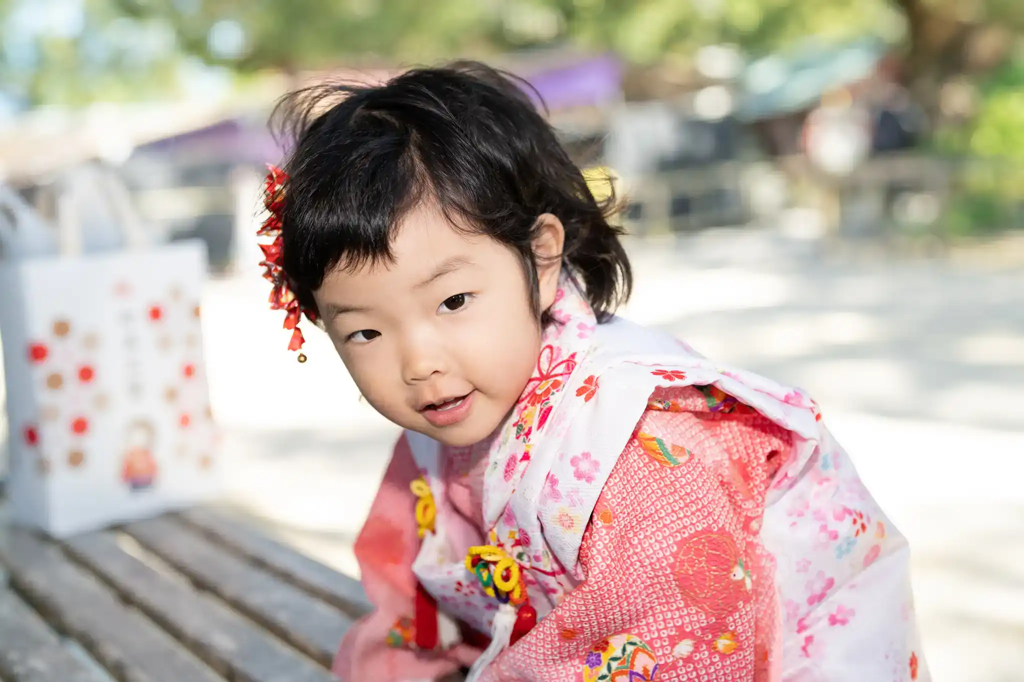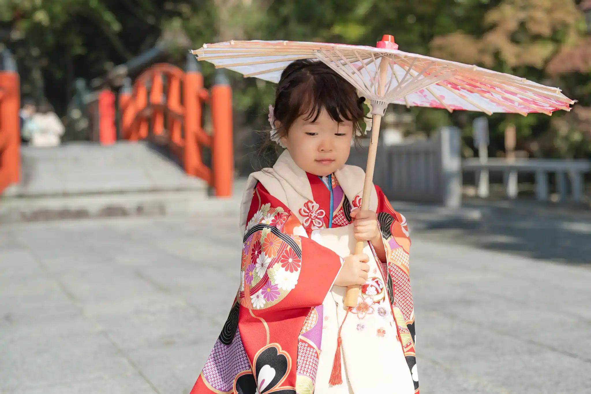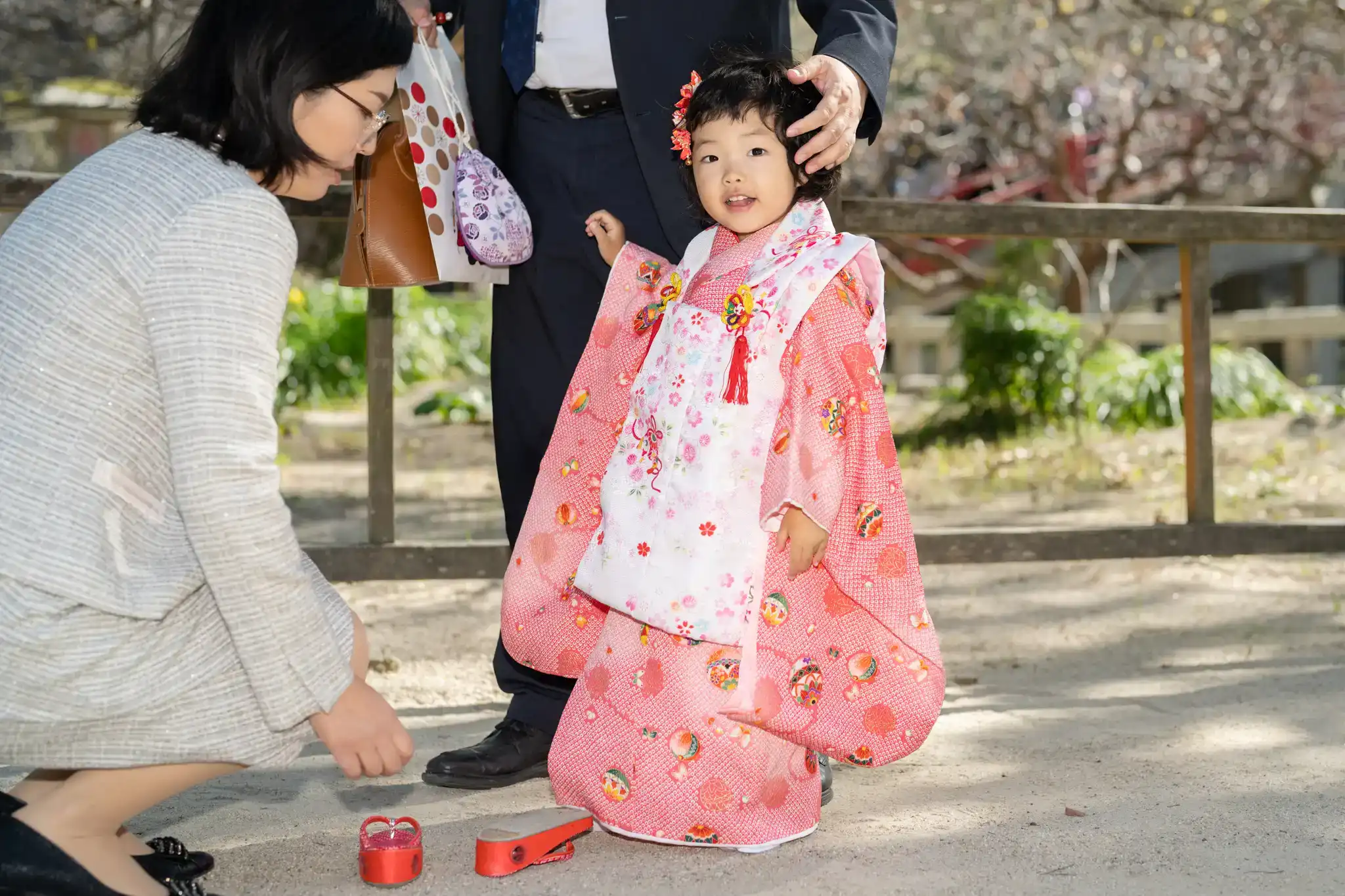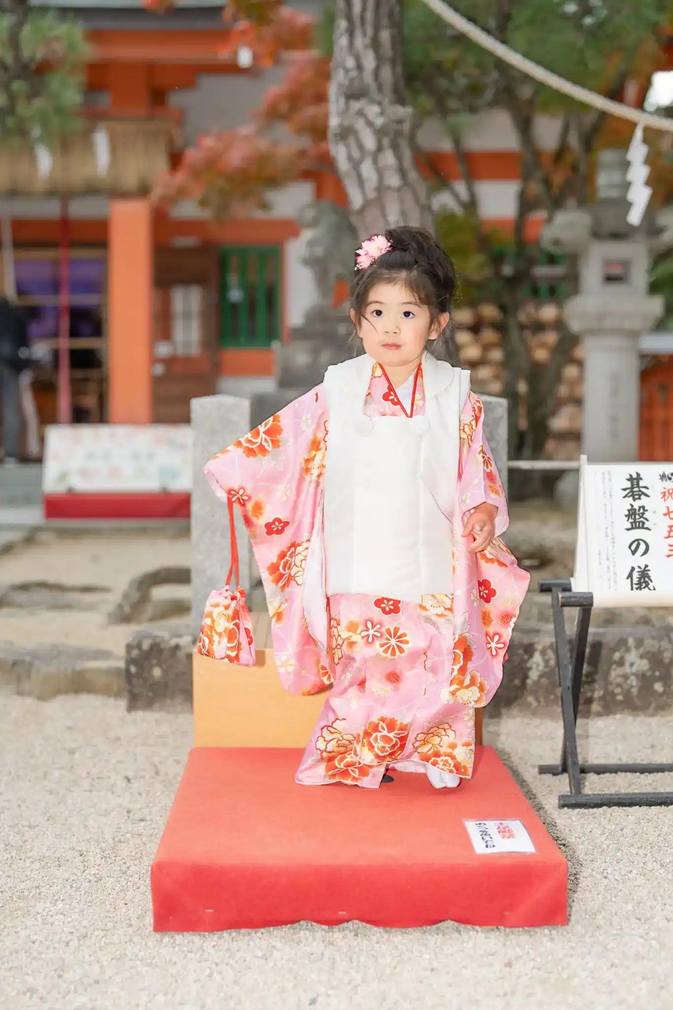 赤と白の被布がとても可愛らしく、髪飾りとの組み合わせもよく映えていました。