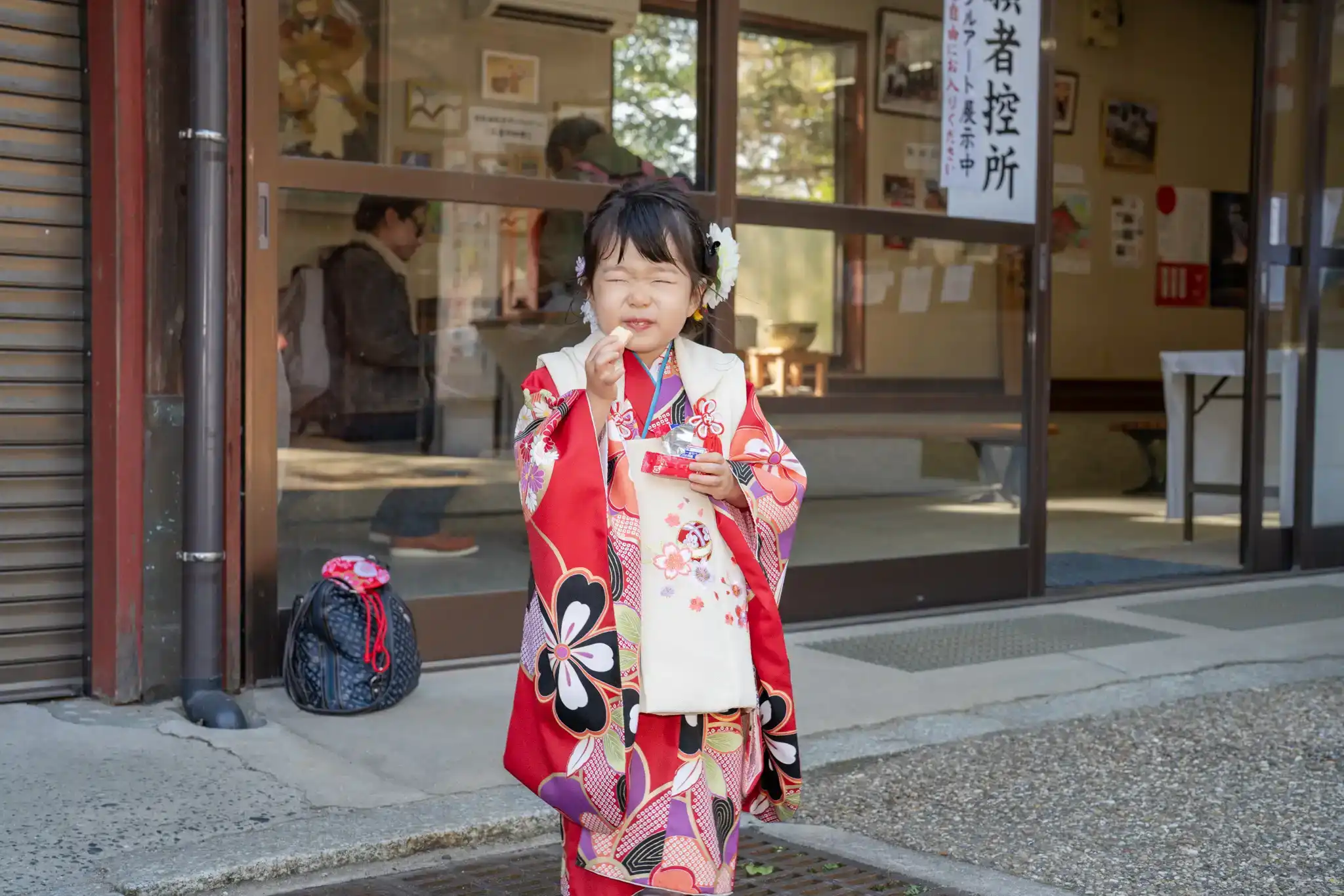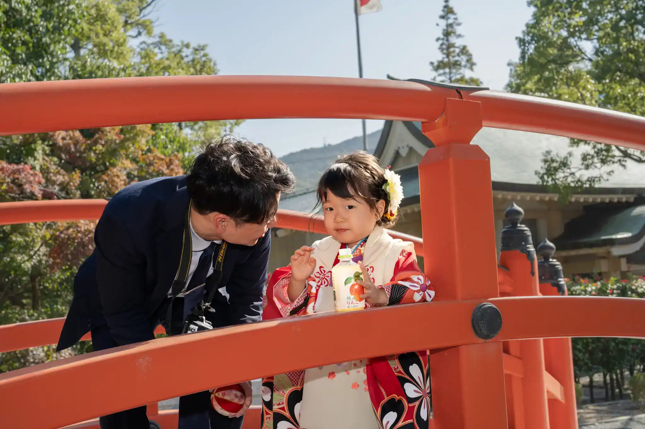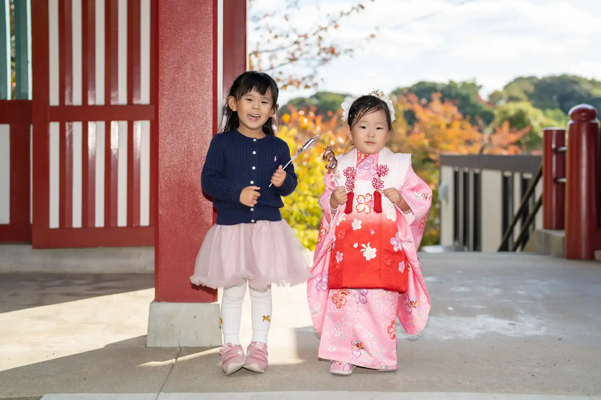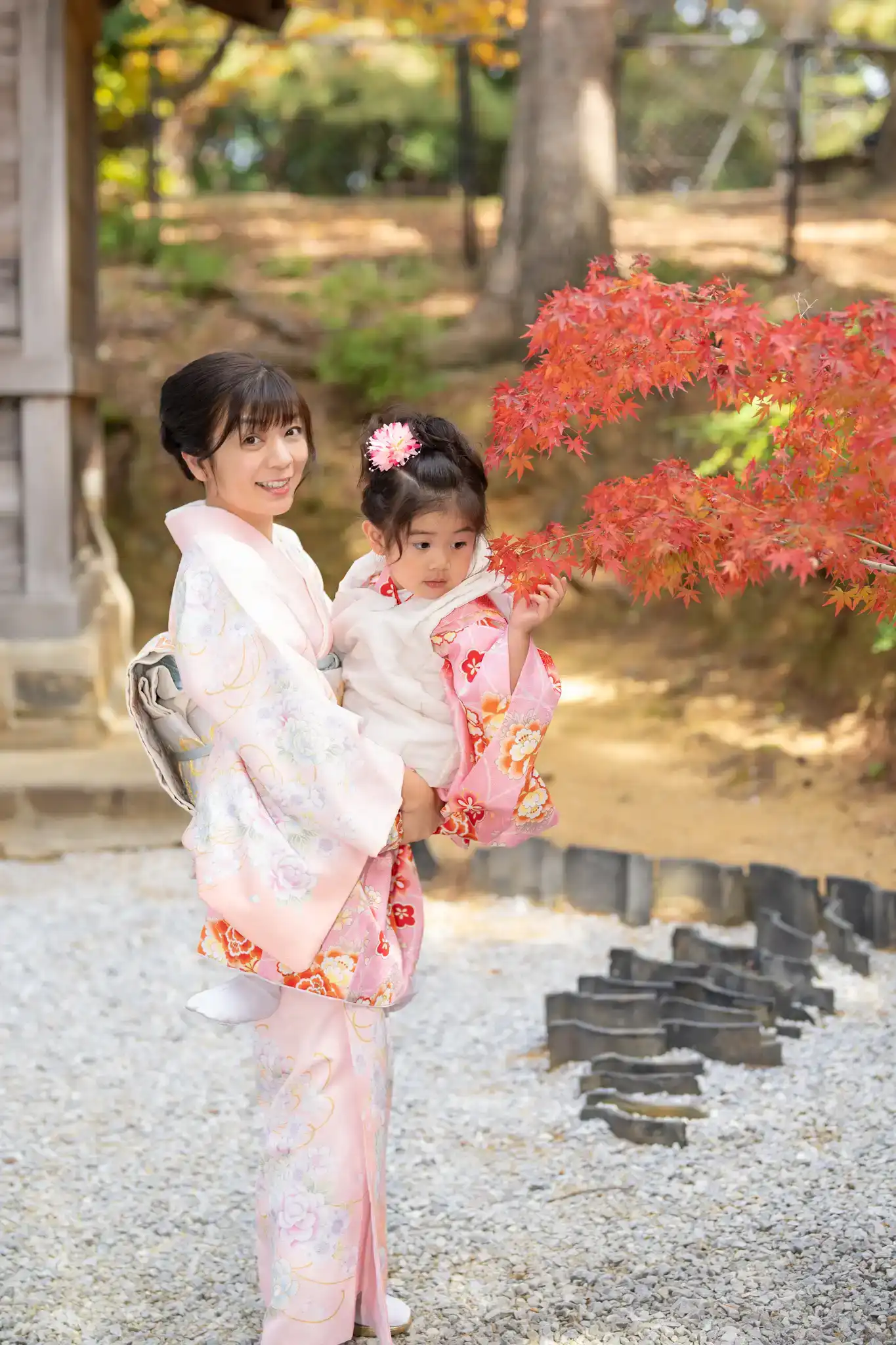 赤と白の被布がとても可愛らしく、髪飾りとの組み合わせもよく映えていました。