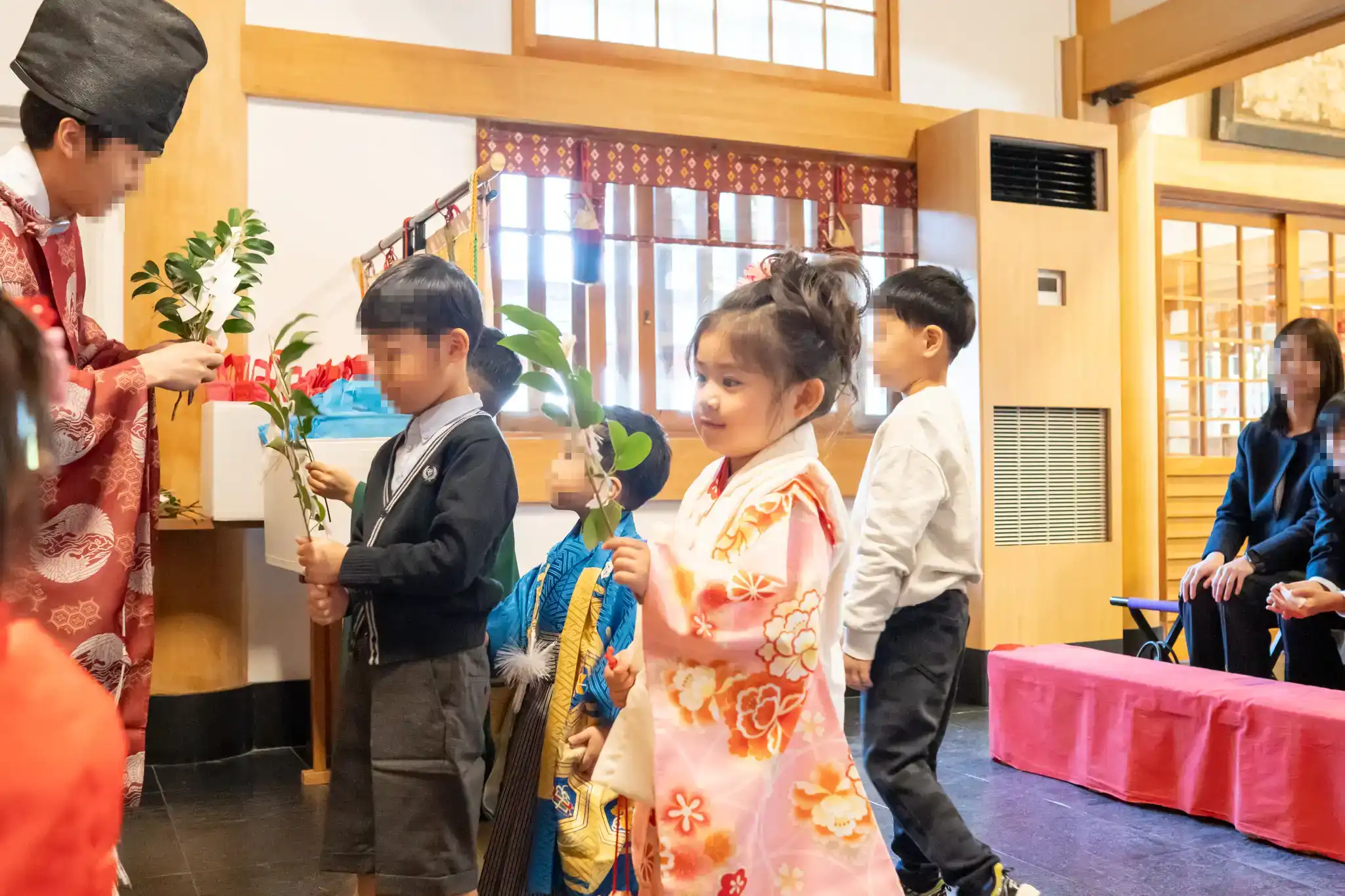やさしい色合いのピンクの被布がとてもよくお似合いで、晴れの日らしい華やかさが印象的でした。