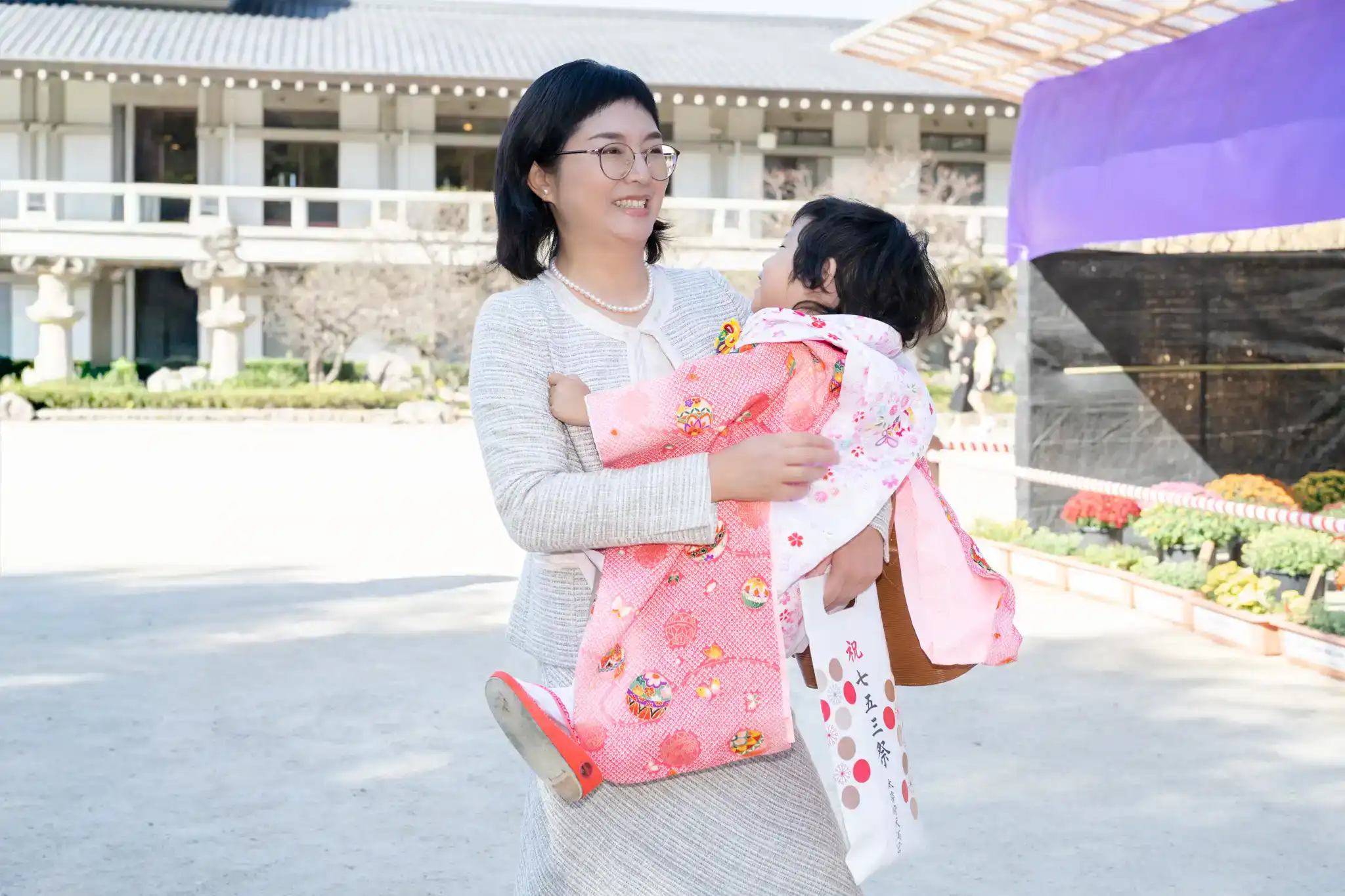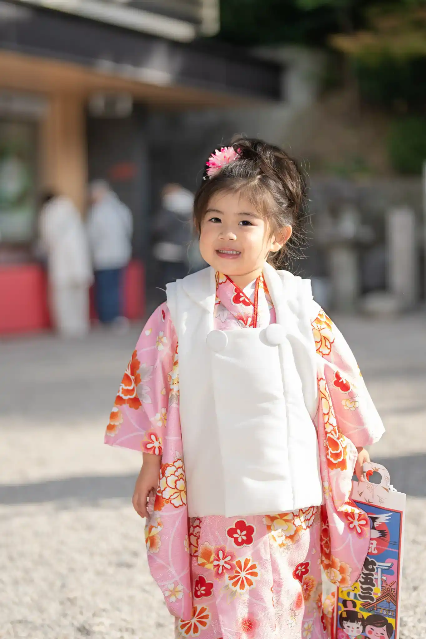 今回の主役は、淡いピンクの着物に白の被布を合わせた、やさしさと清楚さが際立つ三歳らしい七五三の装い。