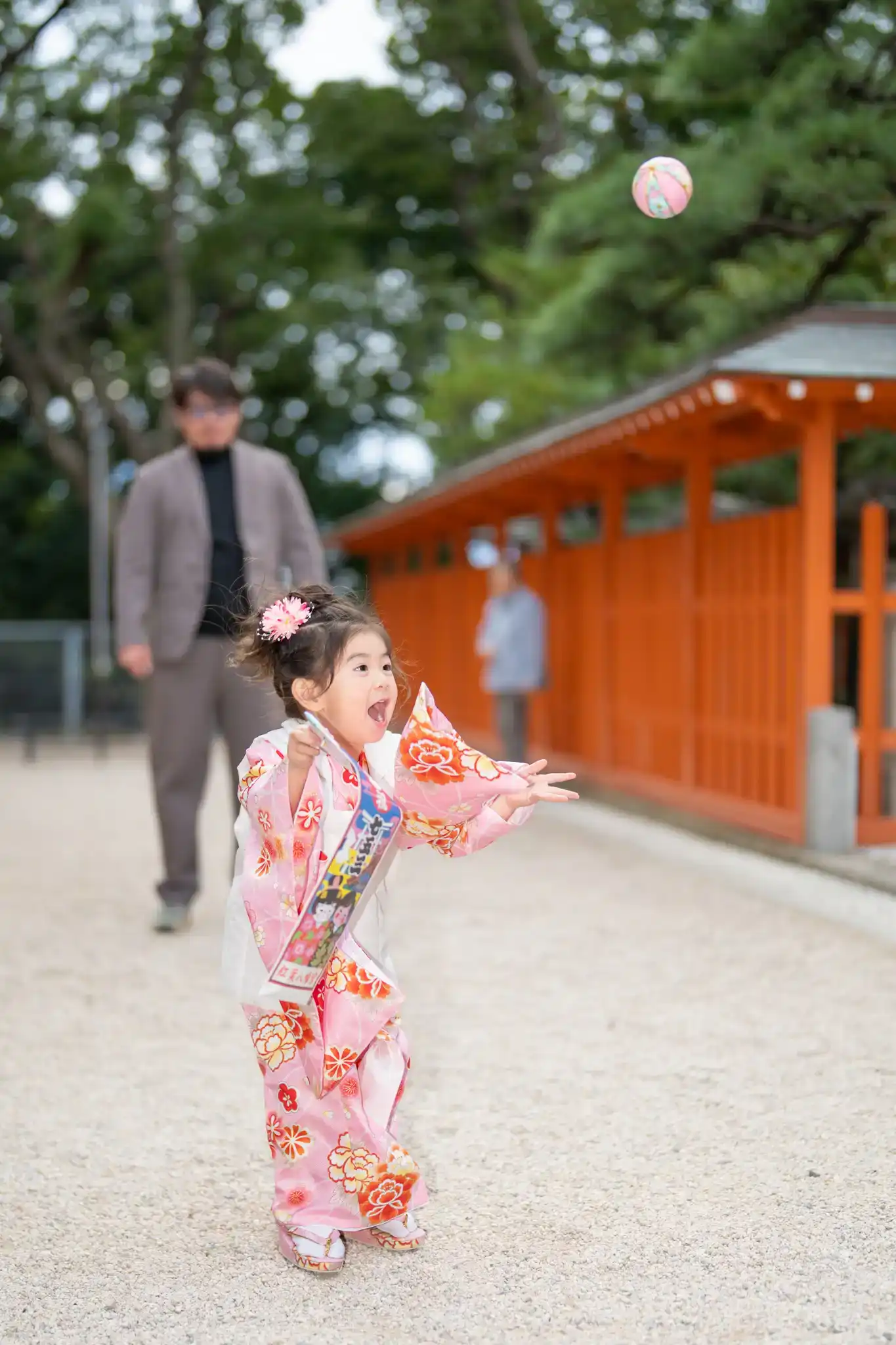 3歳の女の子は、淡いピンクを基調にした着物に赤い被布を合わせた装いで、可愛らしさの中にお祝いらしい華やかさが印象的でした。