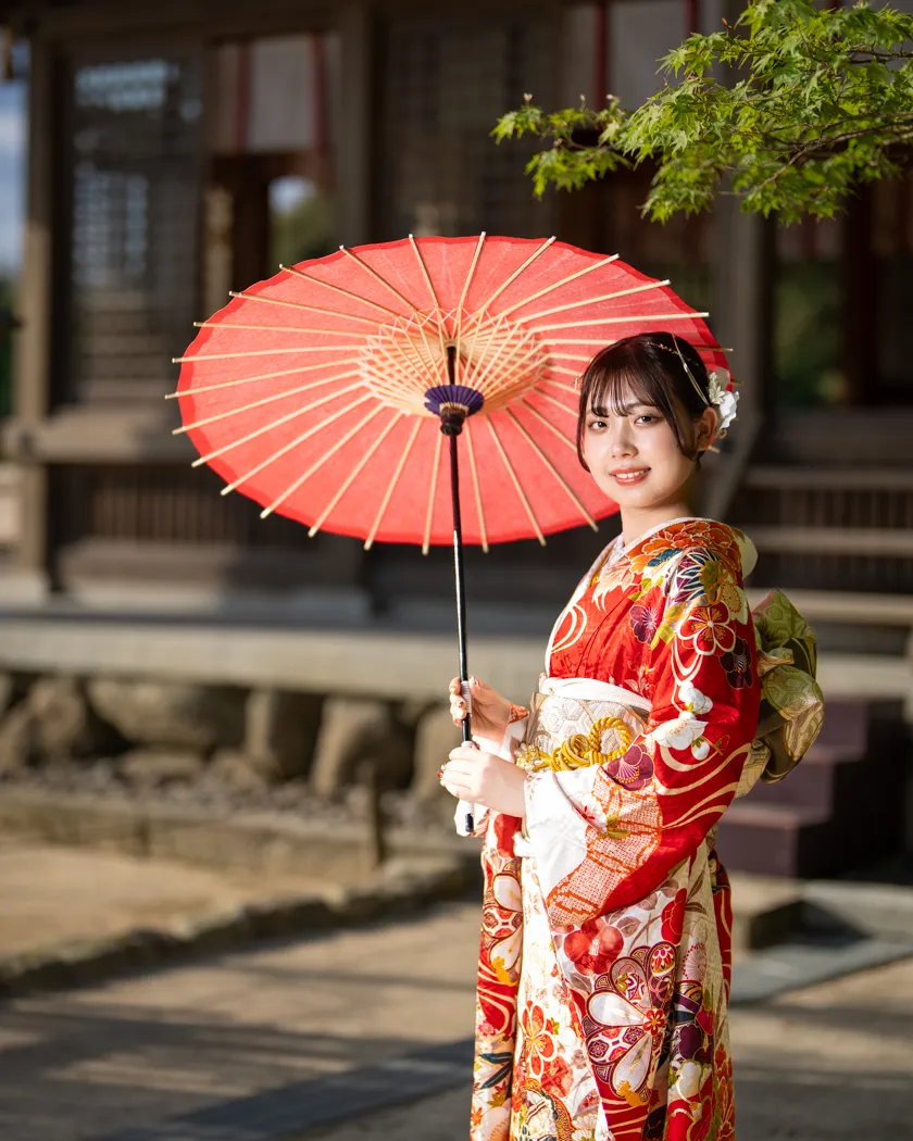 神社での撮影では、厳粛な雰囲気の中、成人式らしい背景を活かした写真を撮影します。春は桜、秋は紅葉など、四季折々の自然とともに、その時だけの表情を大切に残します。