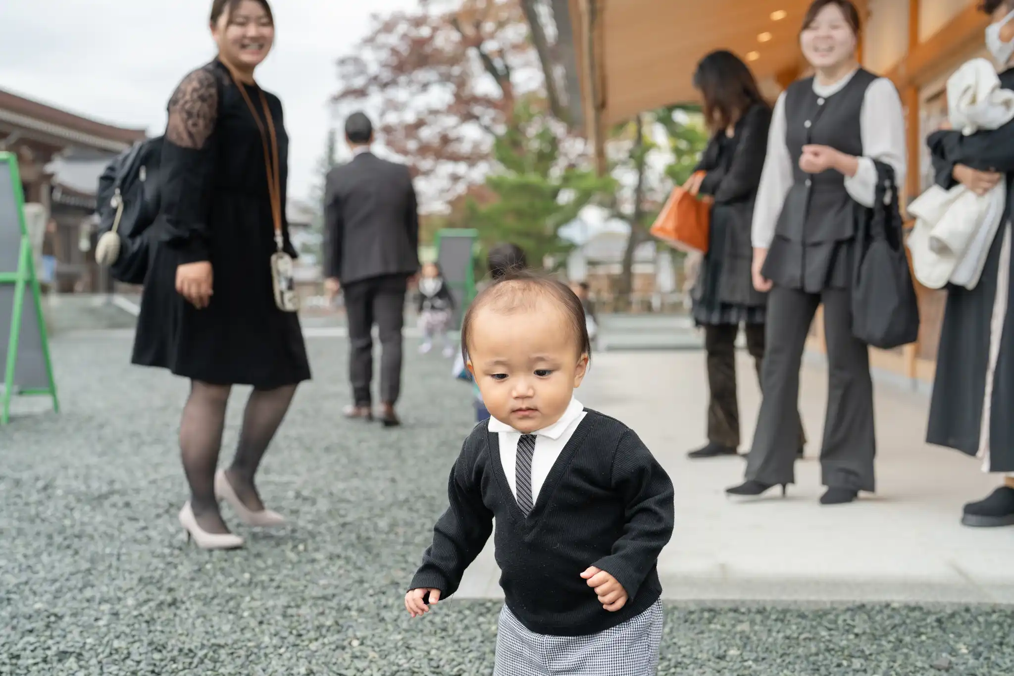 お宮参りの赤ちゃんは、眠っていることが多い中、この日はしっかり目線をくれる場面も。