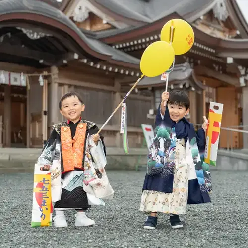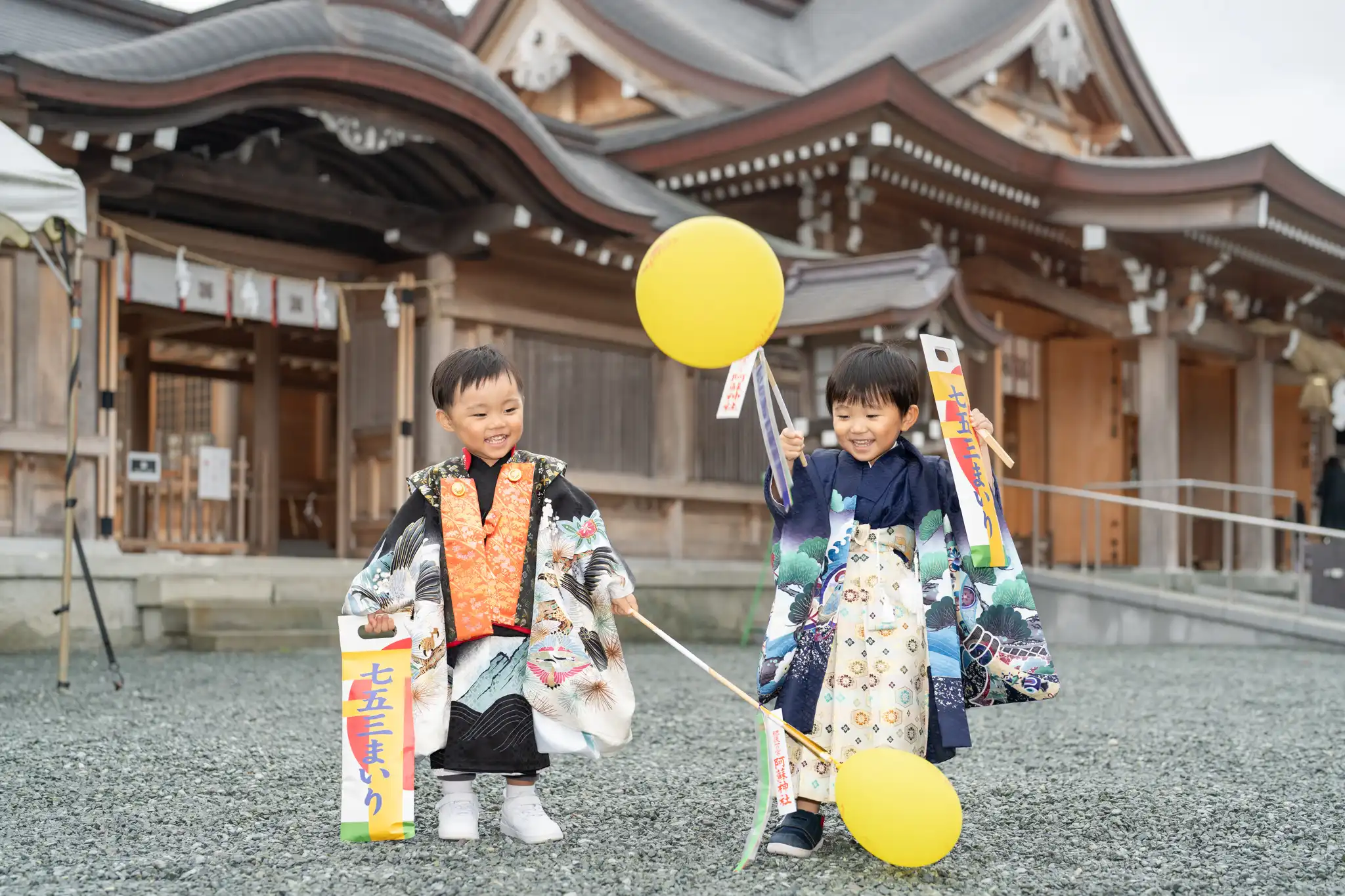 飯塚市の曩祖八幡宮にて、7歳の女の子と3歳の男の子の七五三撮影を行いました。