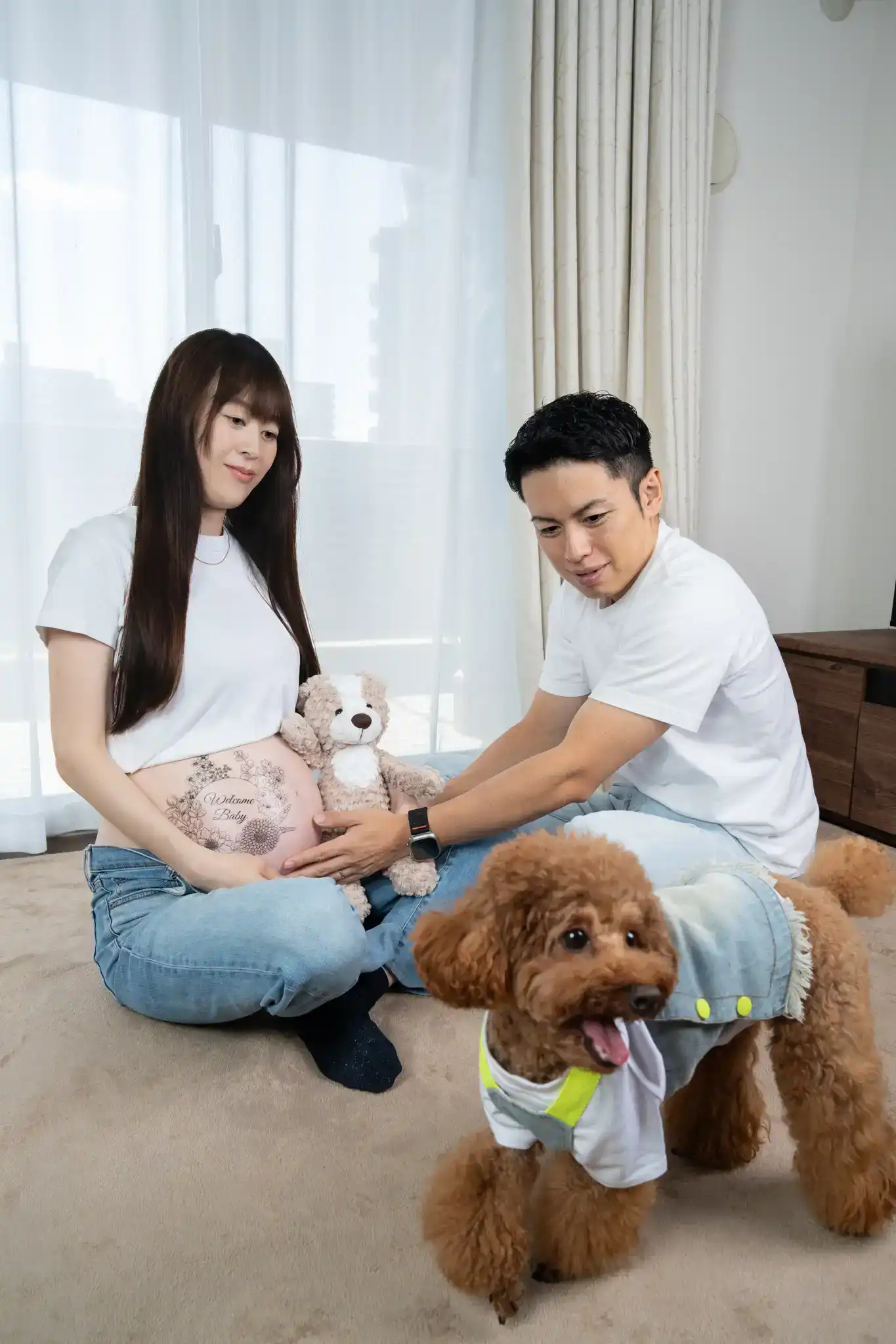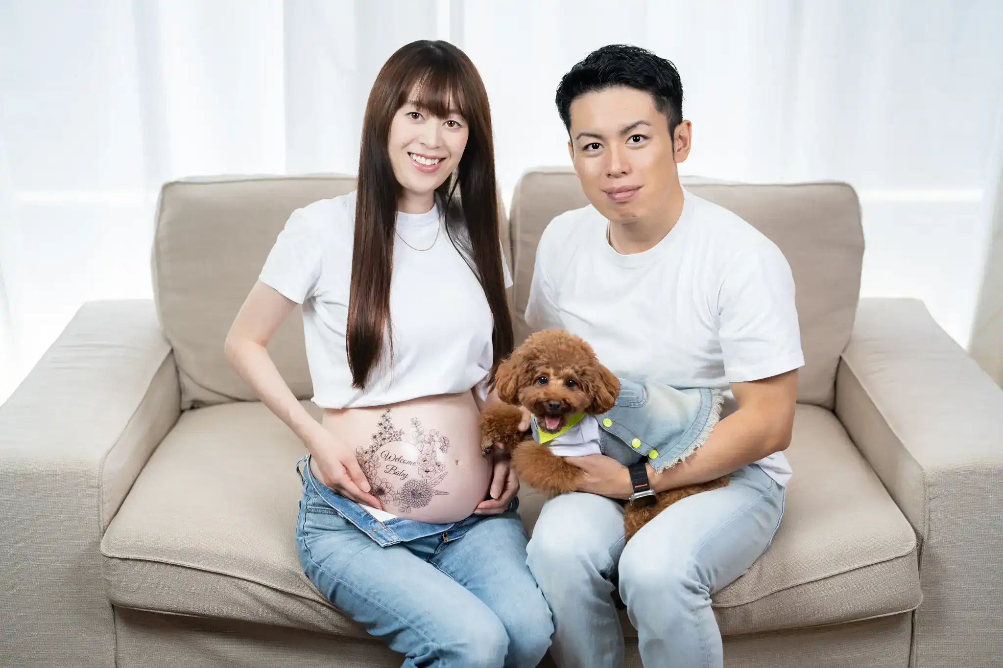 自然光がきれいなご自宅で、ご夫婦とワンちゃんのマタニティ撮影です。